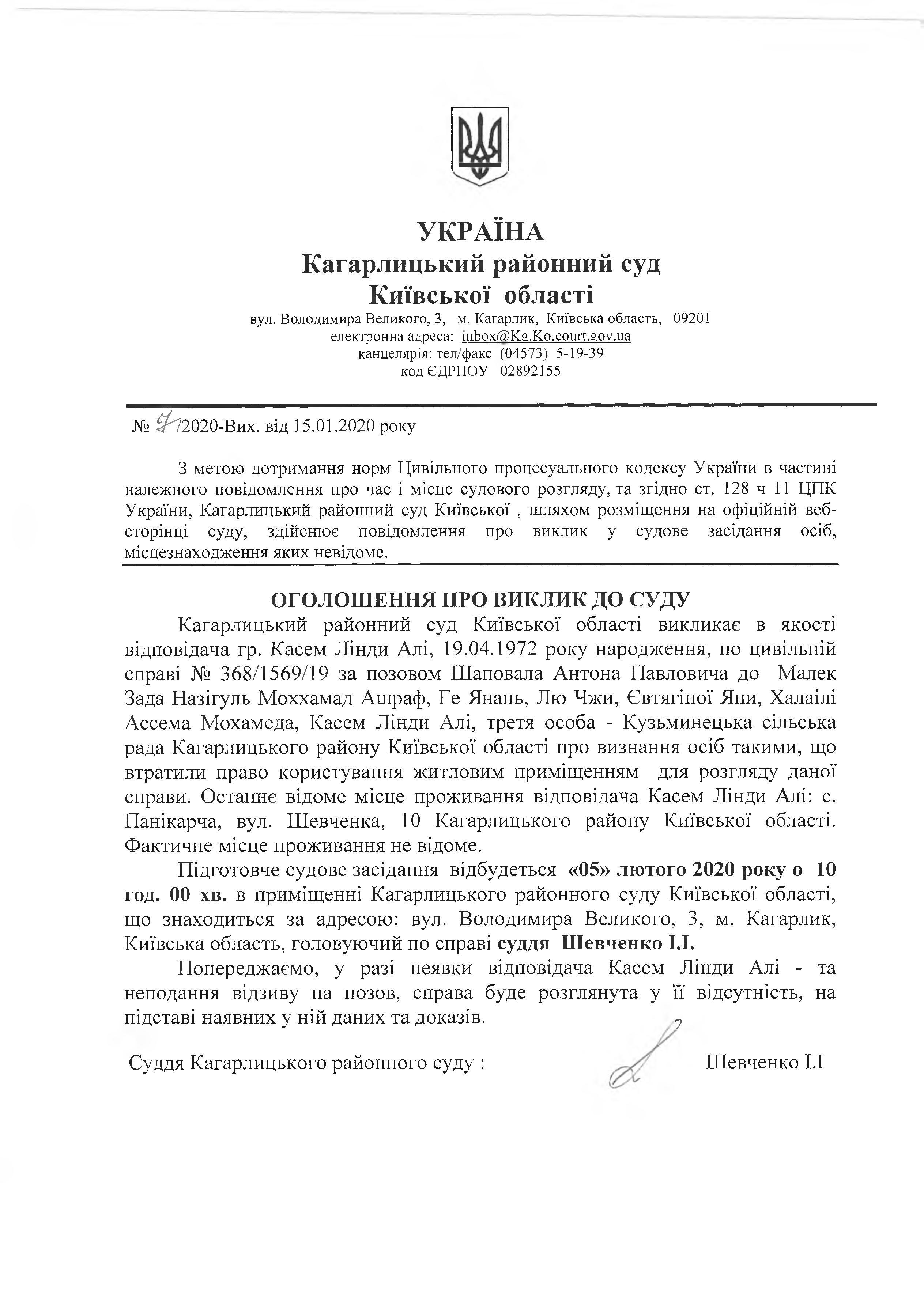 Виклик до суду Касем Лінду Ана на 05.02.2020р.