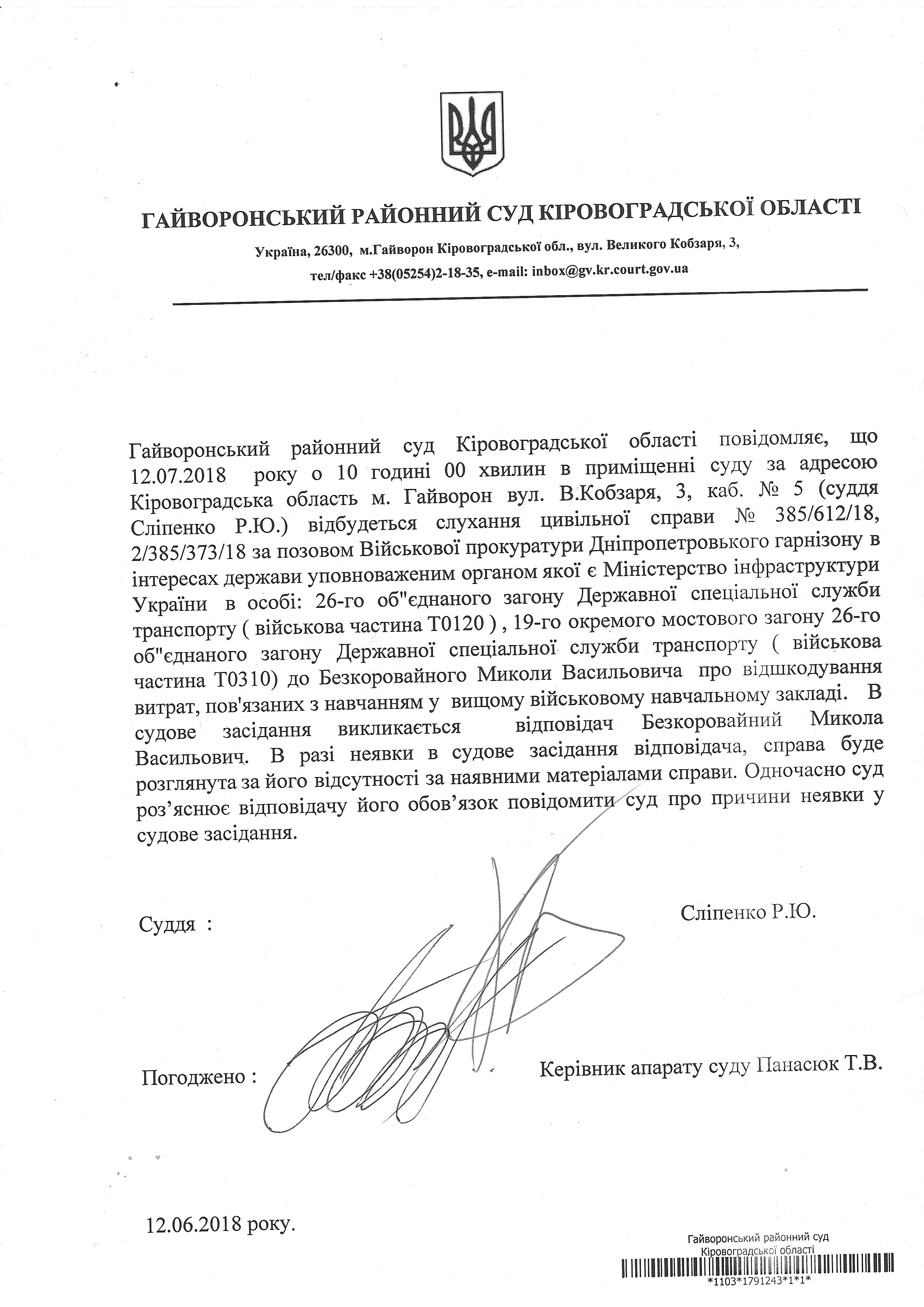 Повідомлення про виклик до суду Безкоровайного Миколу Васильовича