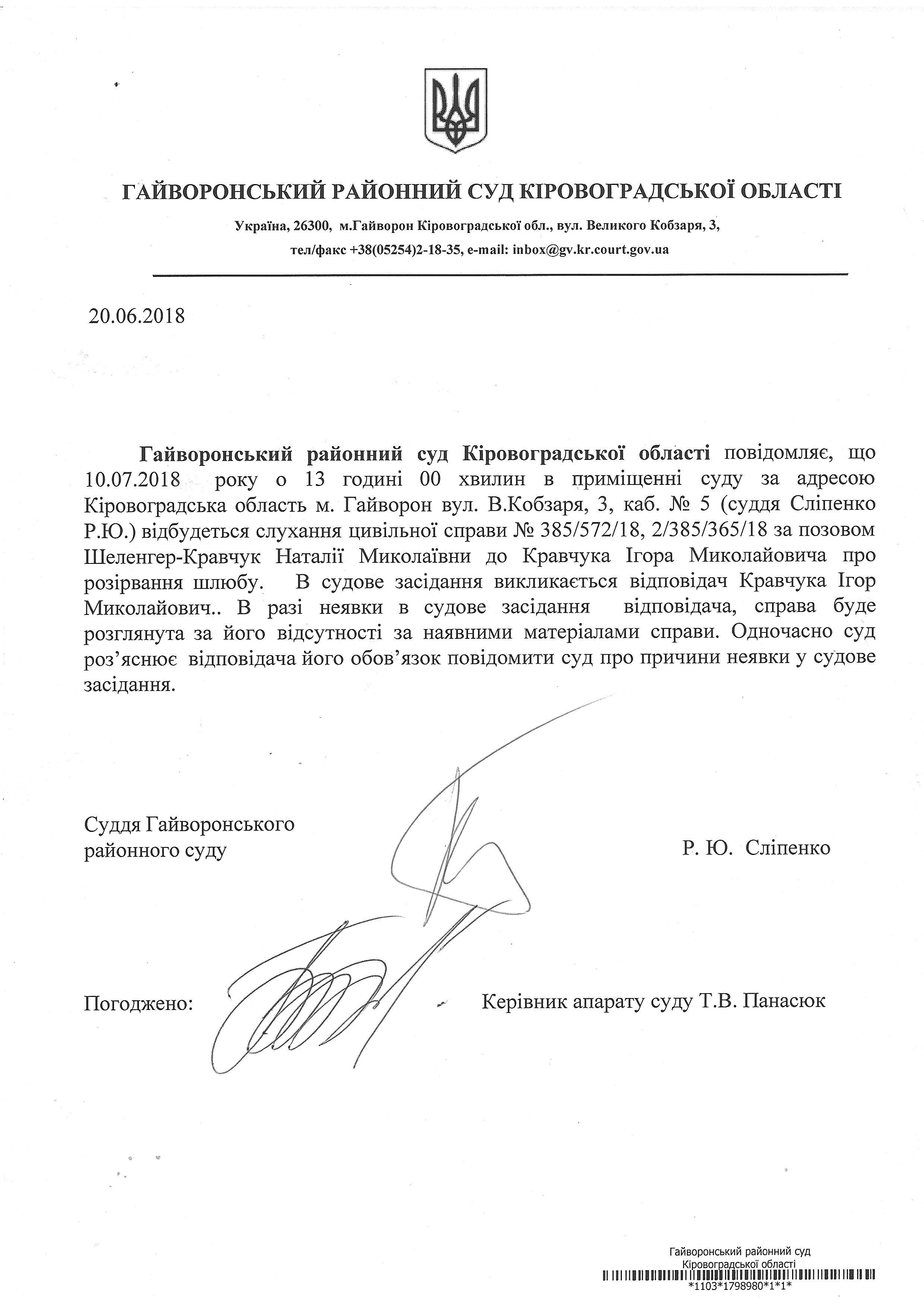 Повідомлення про виклик до суду відповідача Кравчука Ігоря Миколайовича