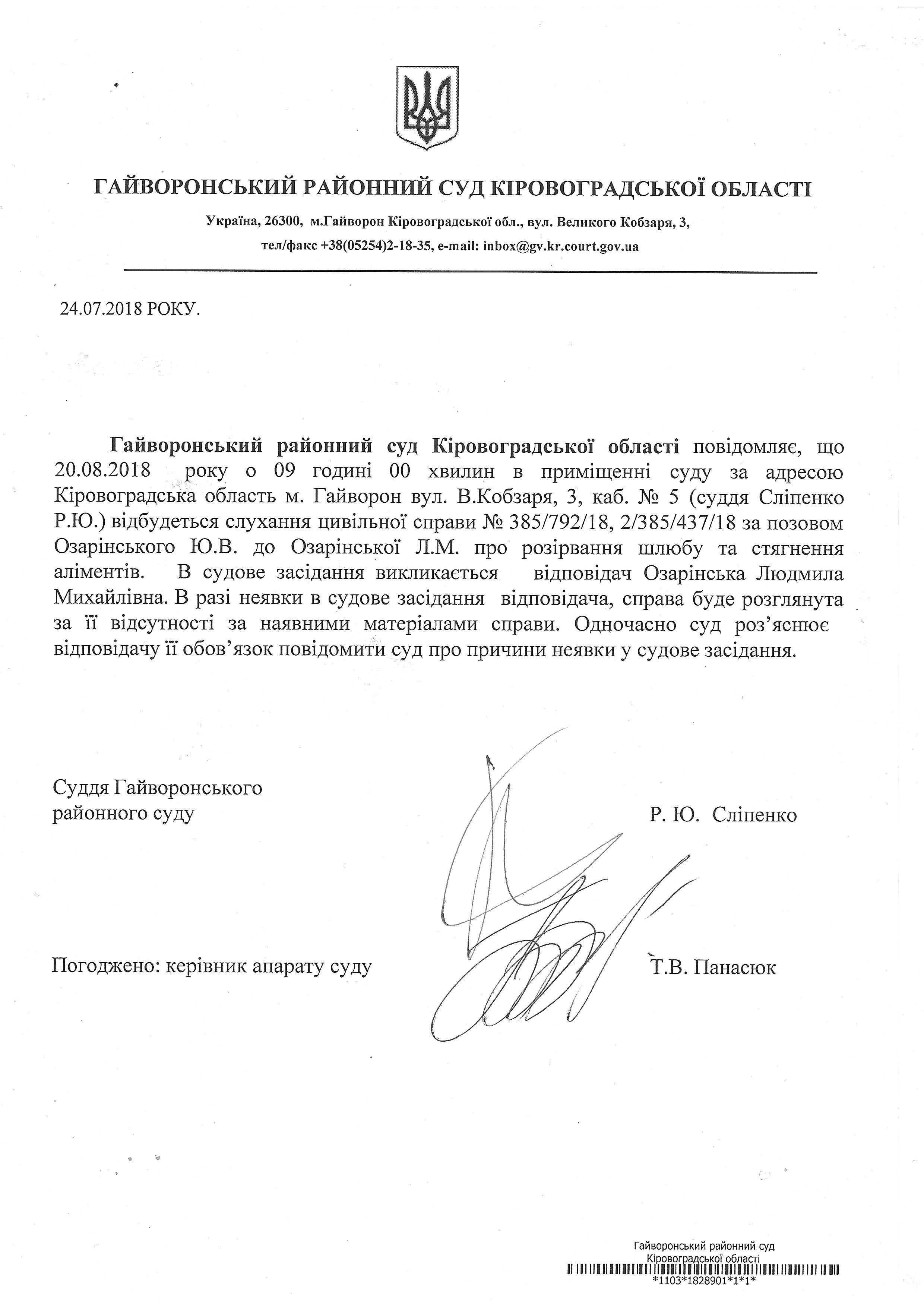 Повідомлення про виклик до суду - відповідач Озарінська Людмила Михайлівна
