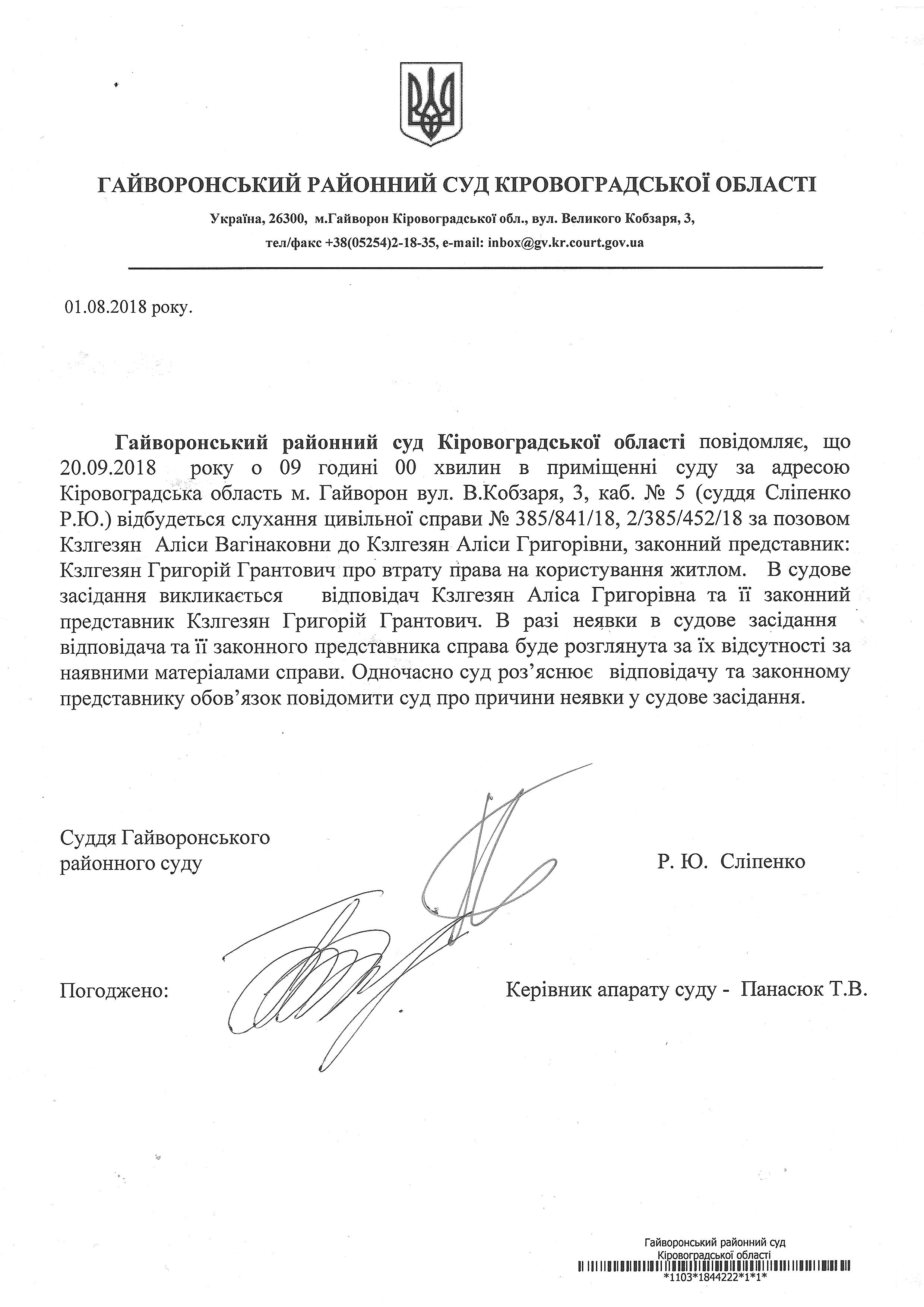 Повідомлення про виклик до суду - відповідач Кзлгезян Григорій Грантович