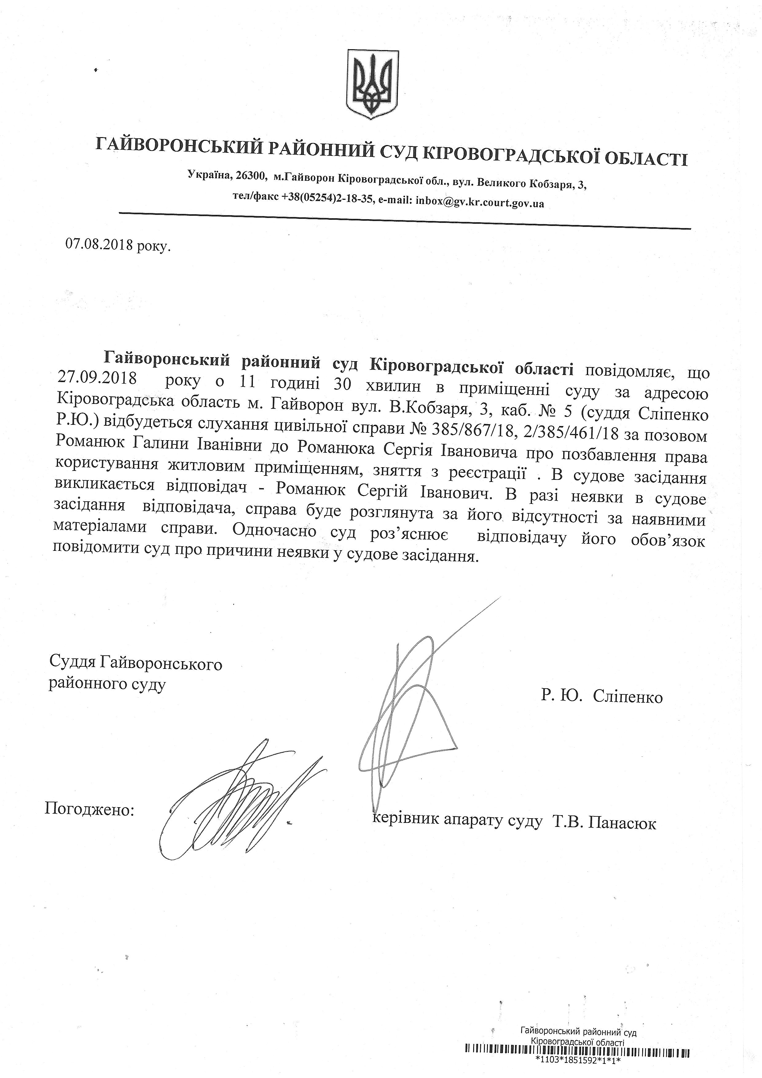 Повідомлення про виклик до суду відповідача - Романюк Сергій Іванович