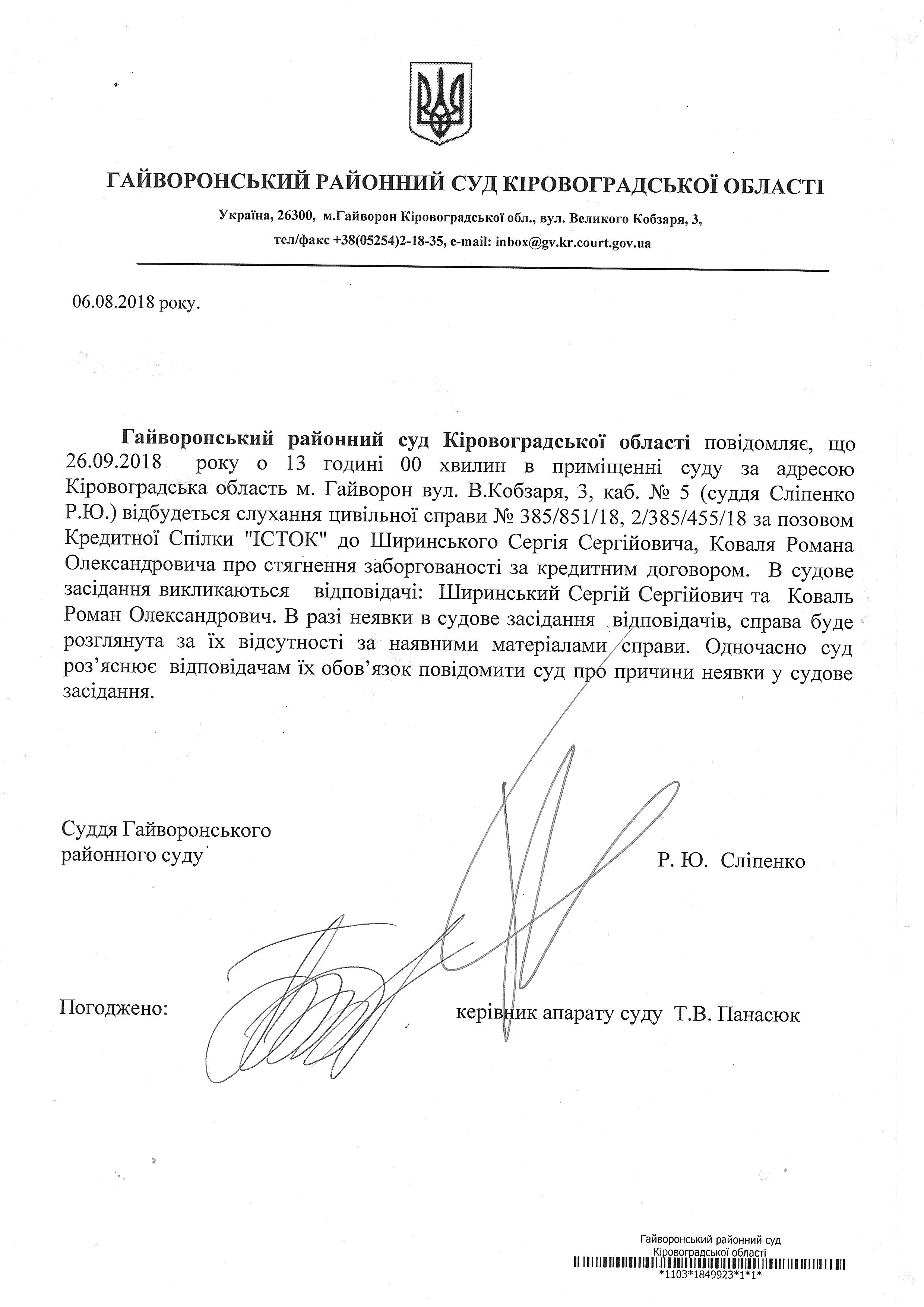 Повідомлення про виклик до суду відповідачі - Ширинський Сергій Сергійович і Коваль Роман Олександрович