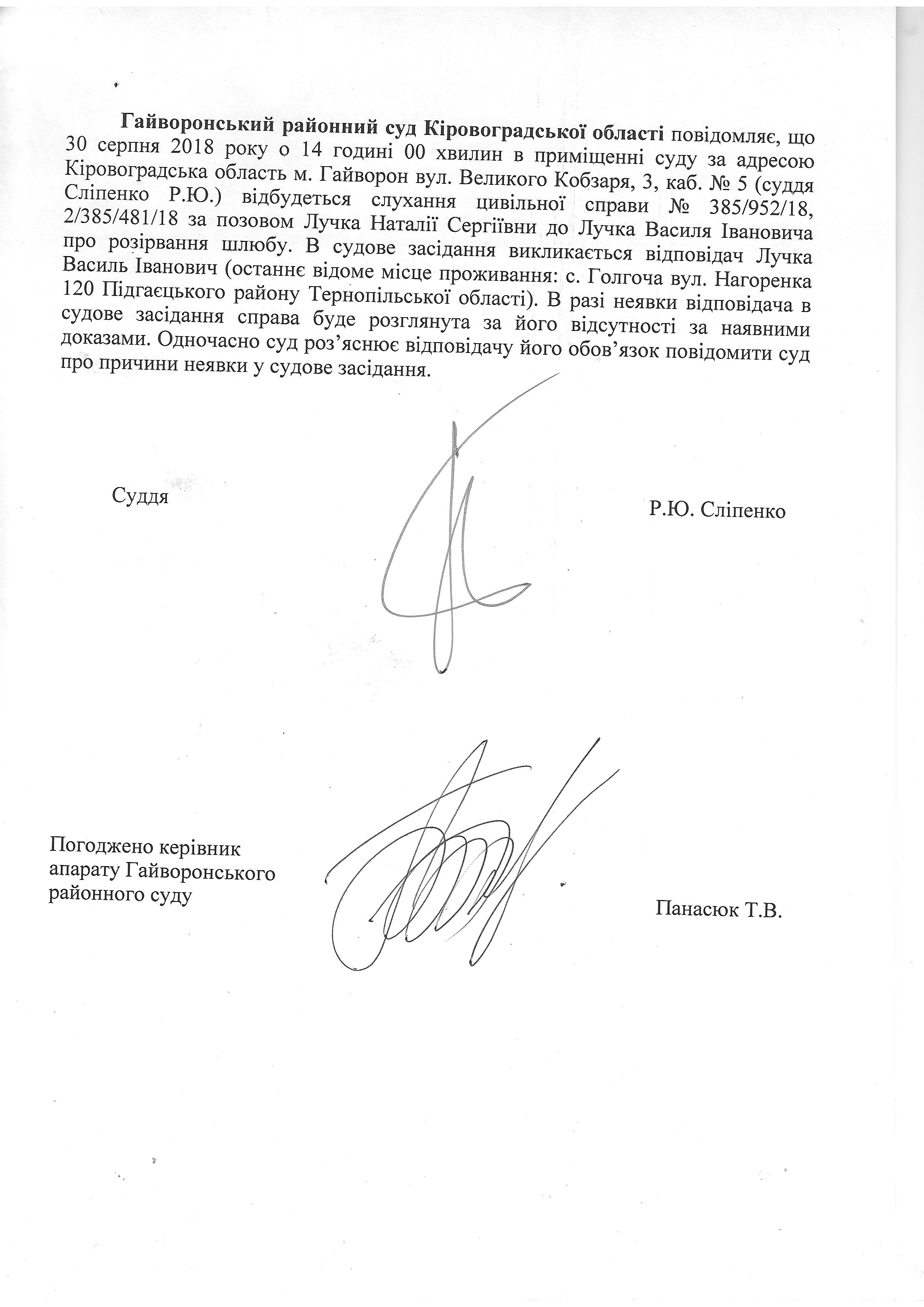 Повідомлення про виклик до суду - відповідач Лучка Василь Іванович