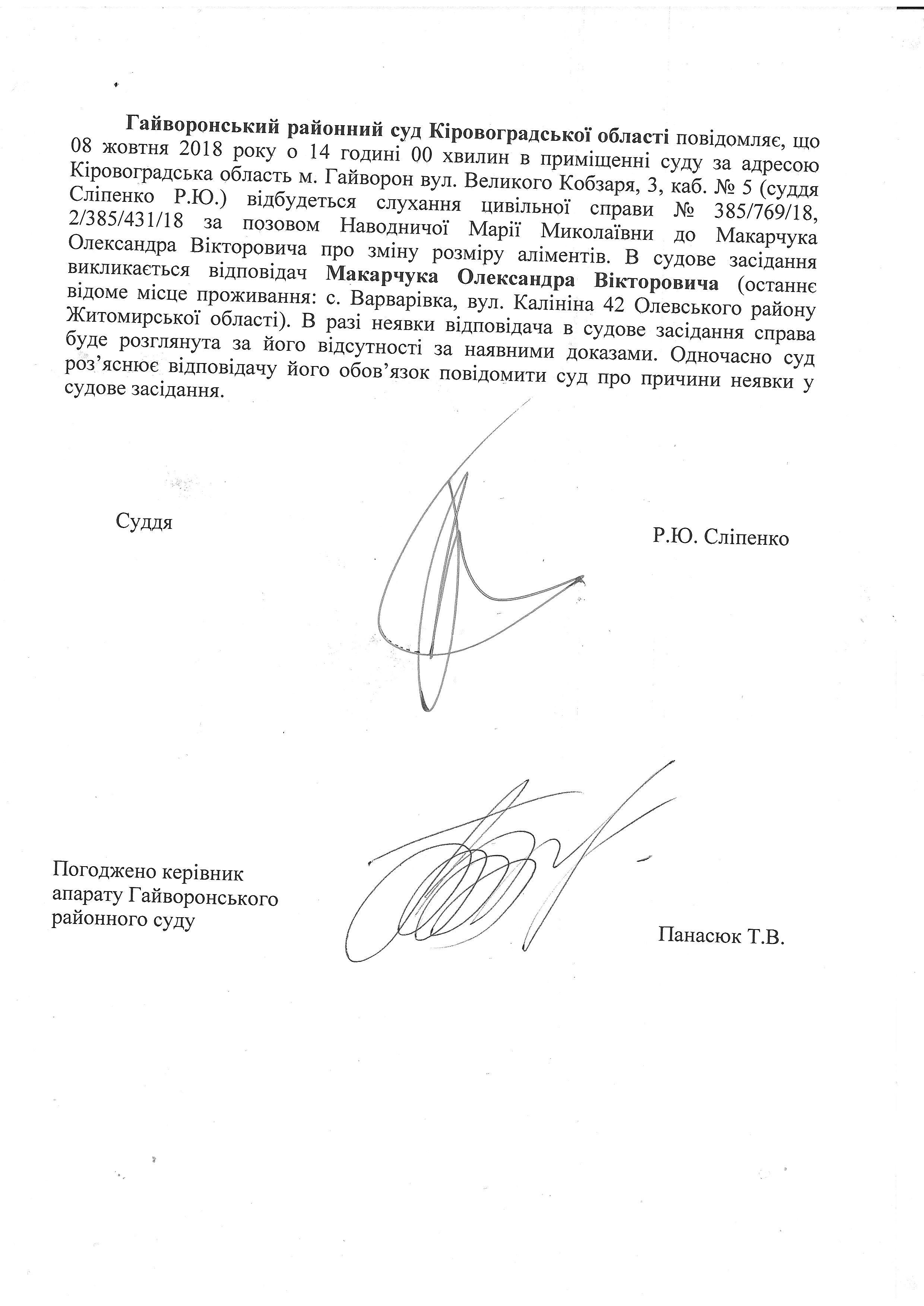 Повідомлення про виклик до суду - відповідач Макарчук Олександр Вікторович