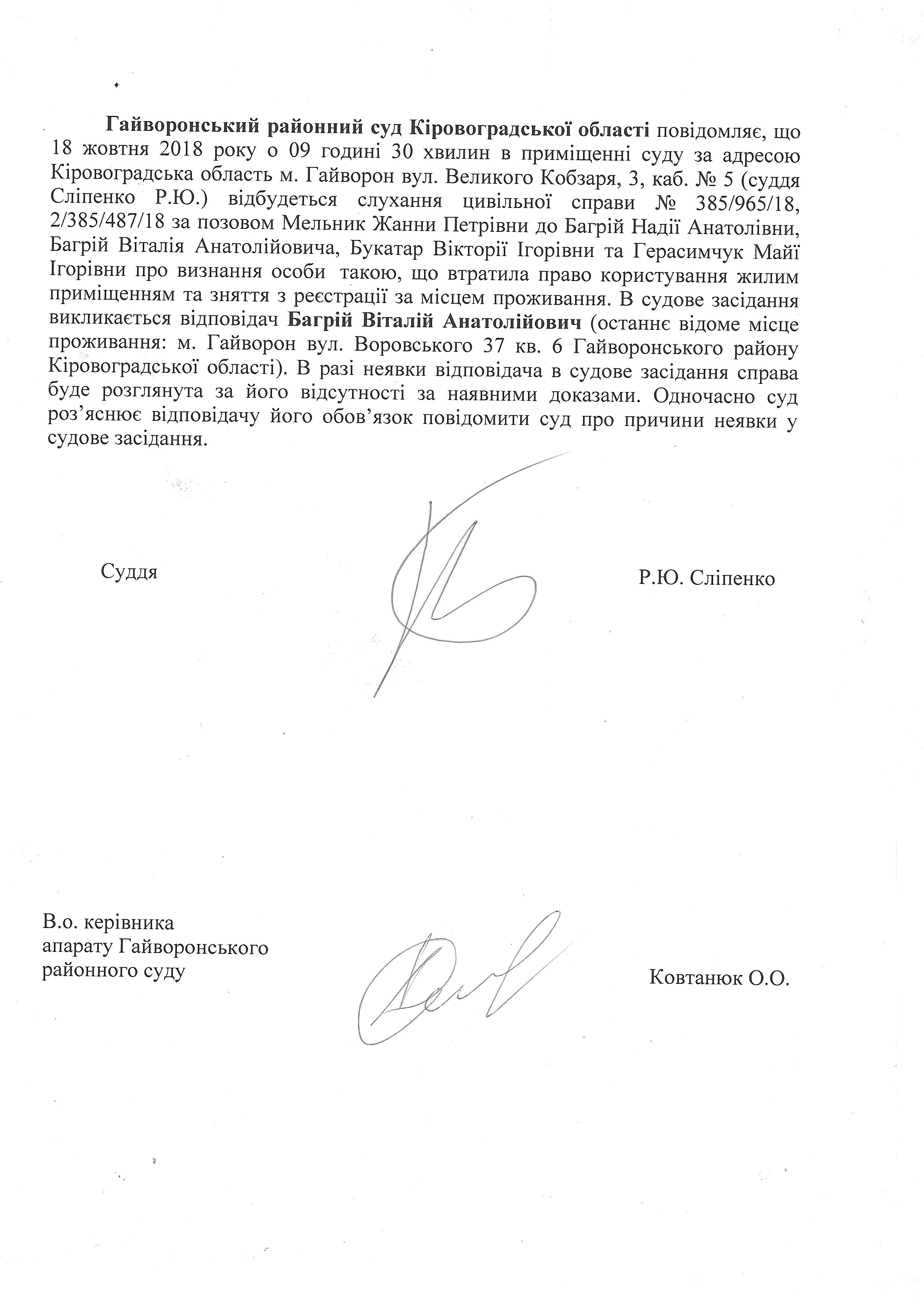 Повідомлення про виклик до суду - відповідач Багрій Віталій Анатолійович