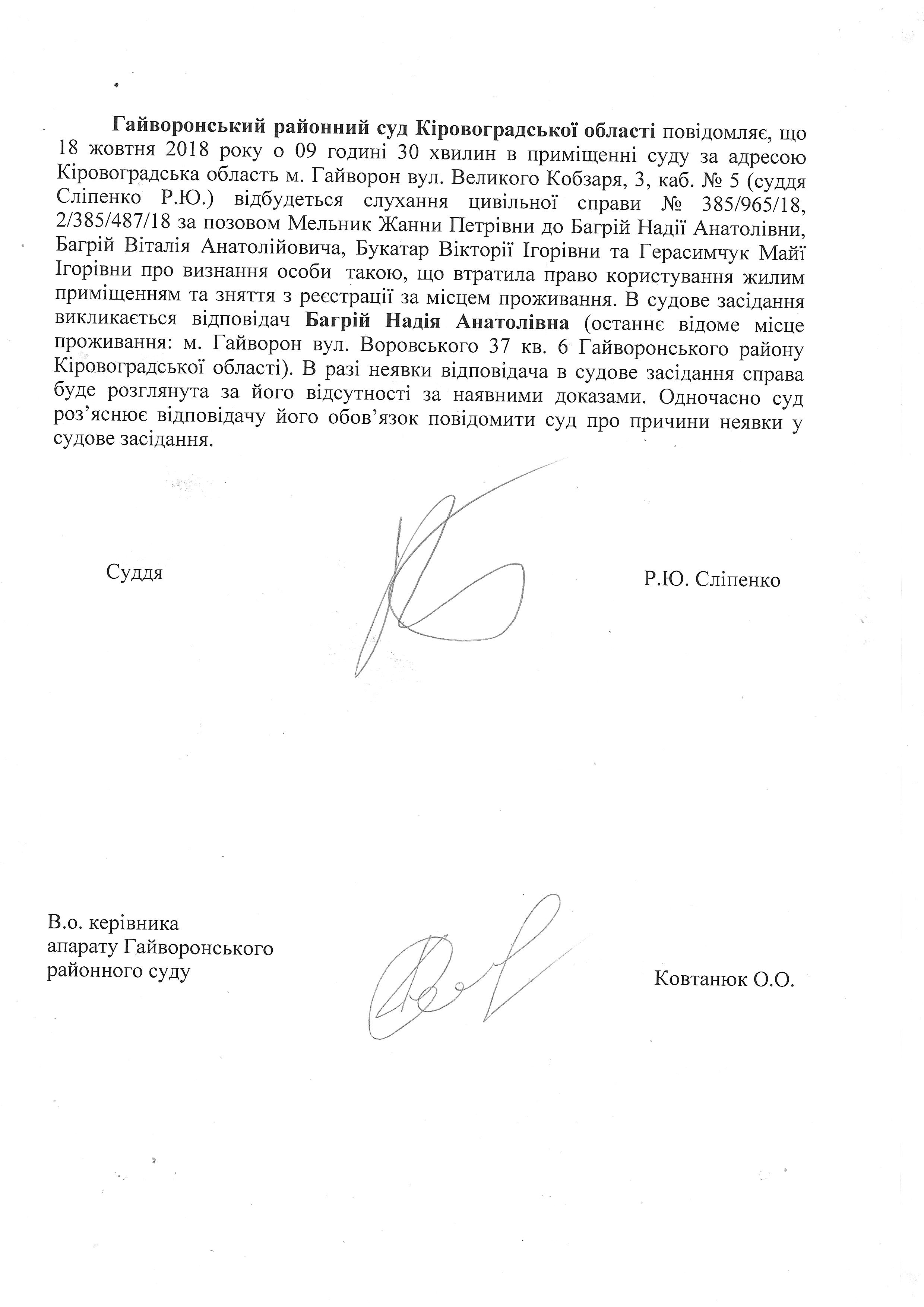 Повідомлення про виклик до суду - відповідач Багрій Надія Анатоліївна