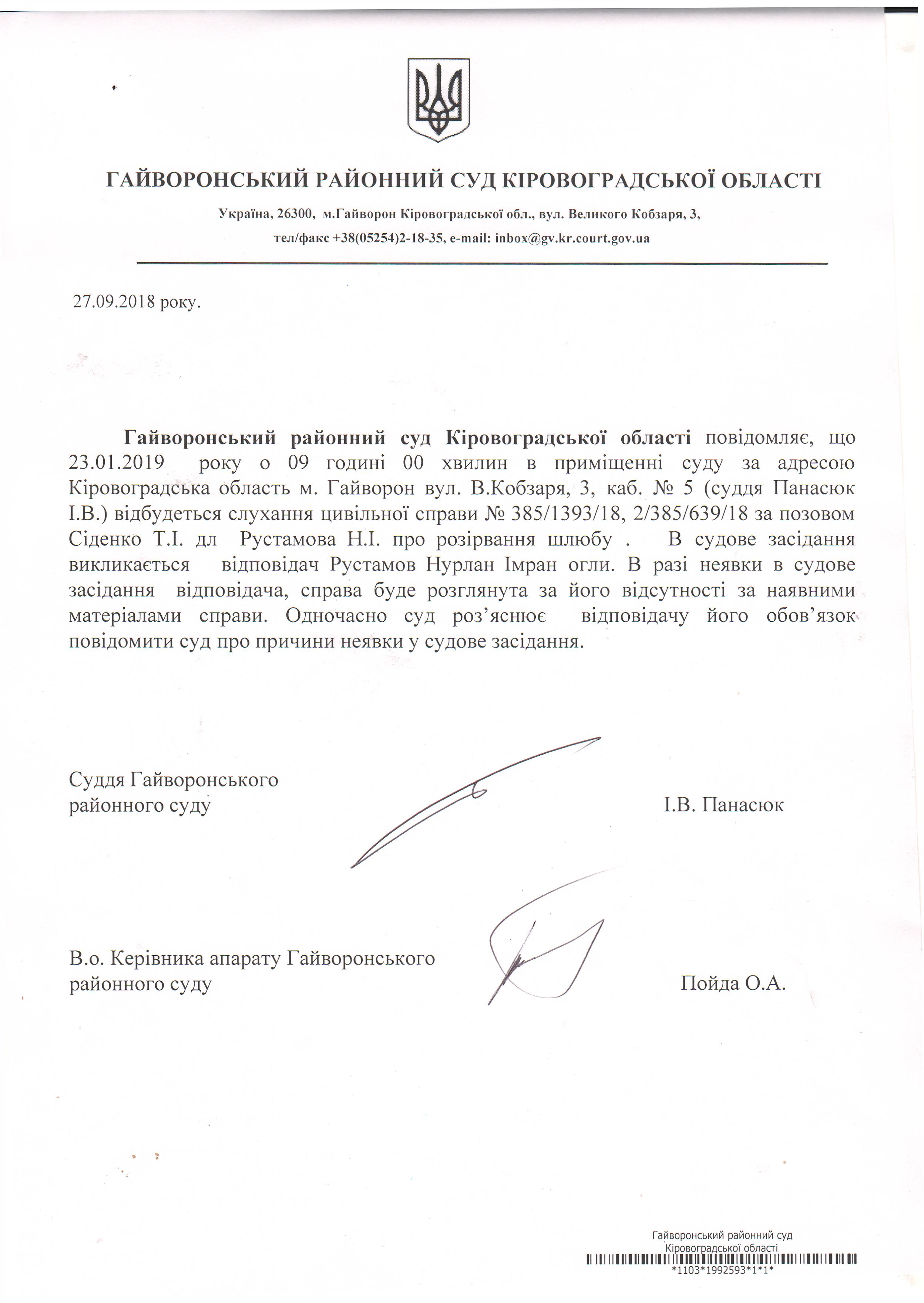 Повідомлення про виклик до суду - відповідач Рустамов Нурлан Імран огли