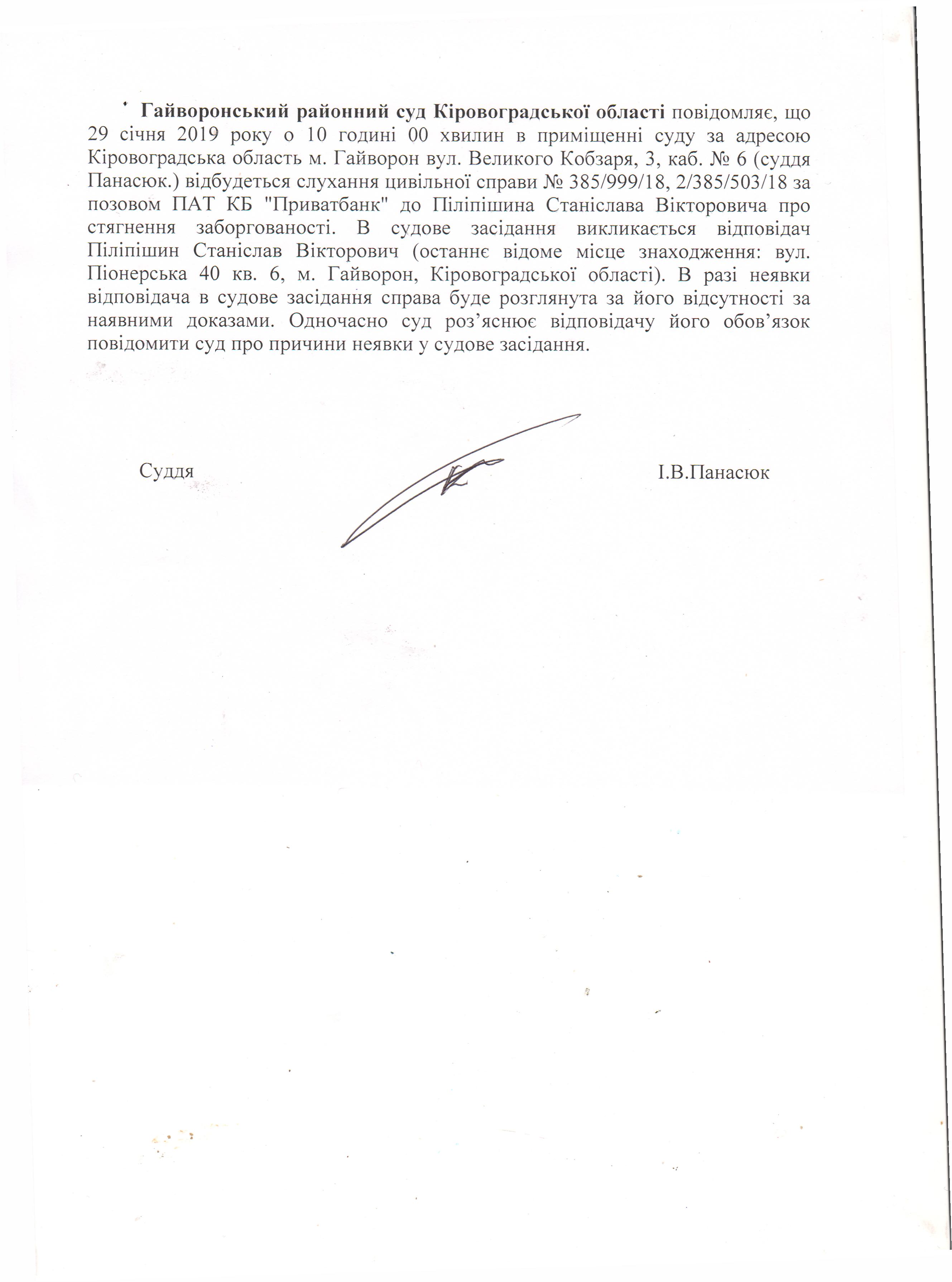 Повідомлення про виклик до суду - відповідач Піліпішин Станіслав Вікторович