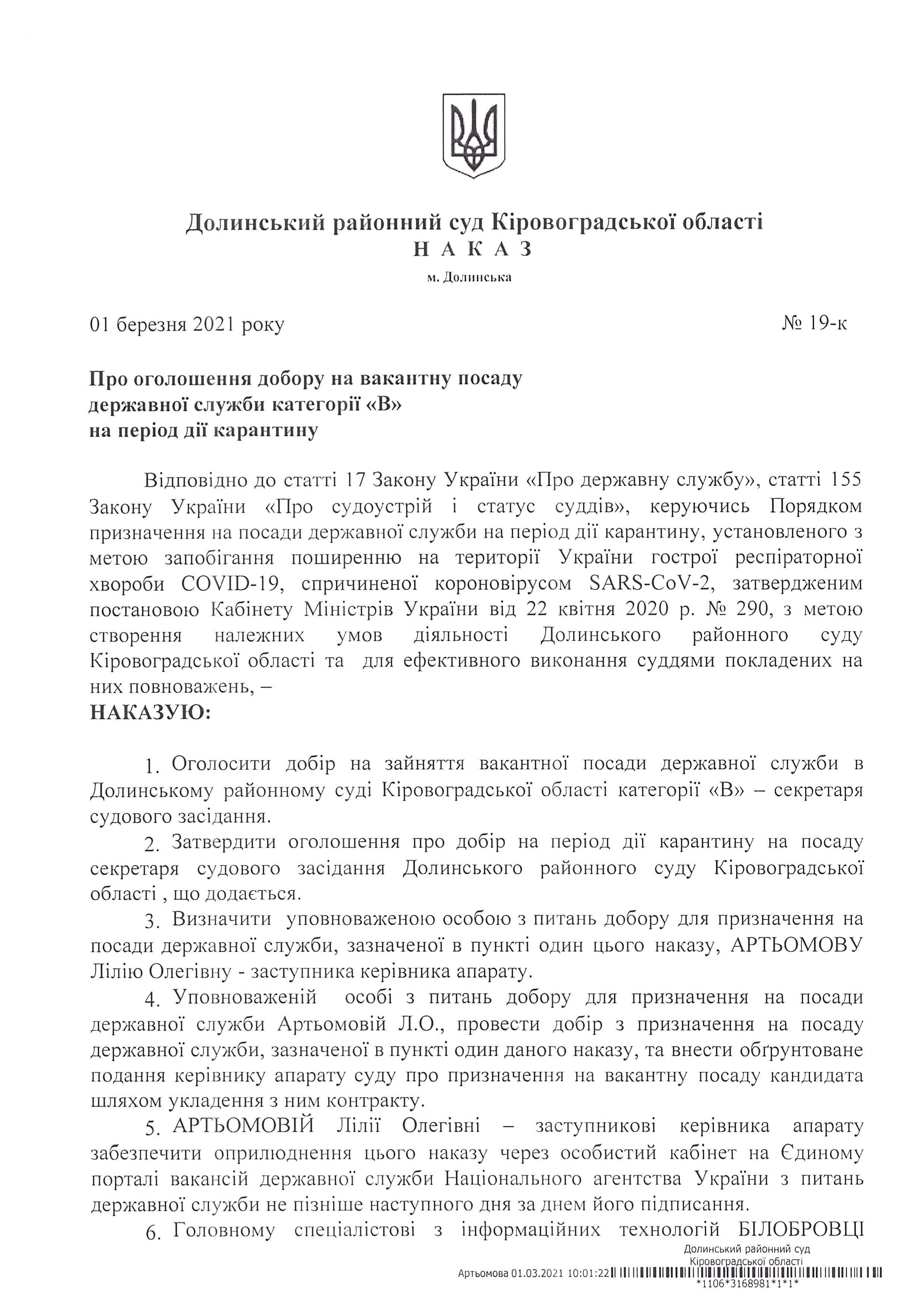 Наказ Про оголошення добору на вакантну посаду державної служби категорії «В» на період дії карантину: