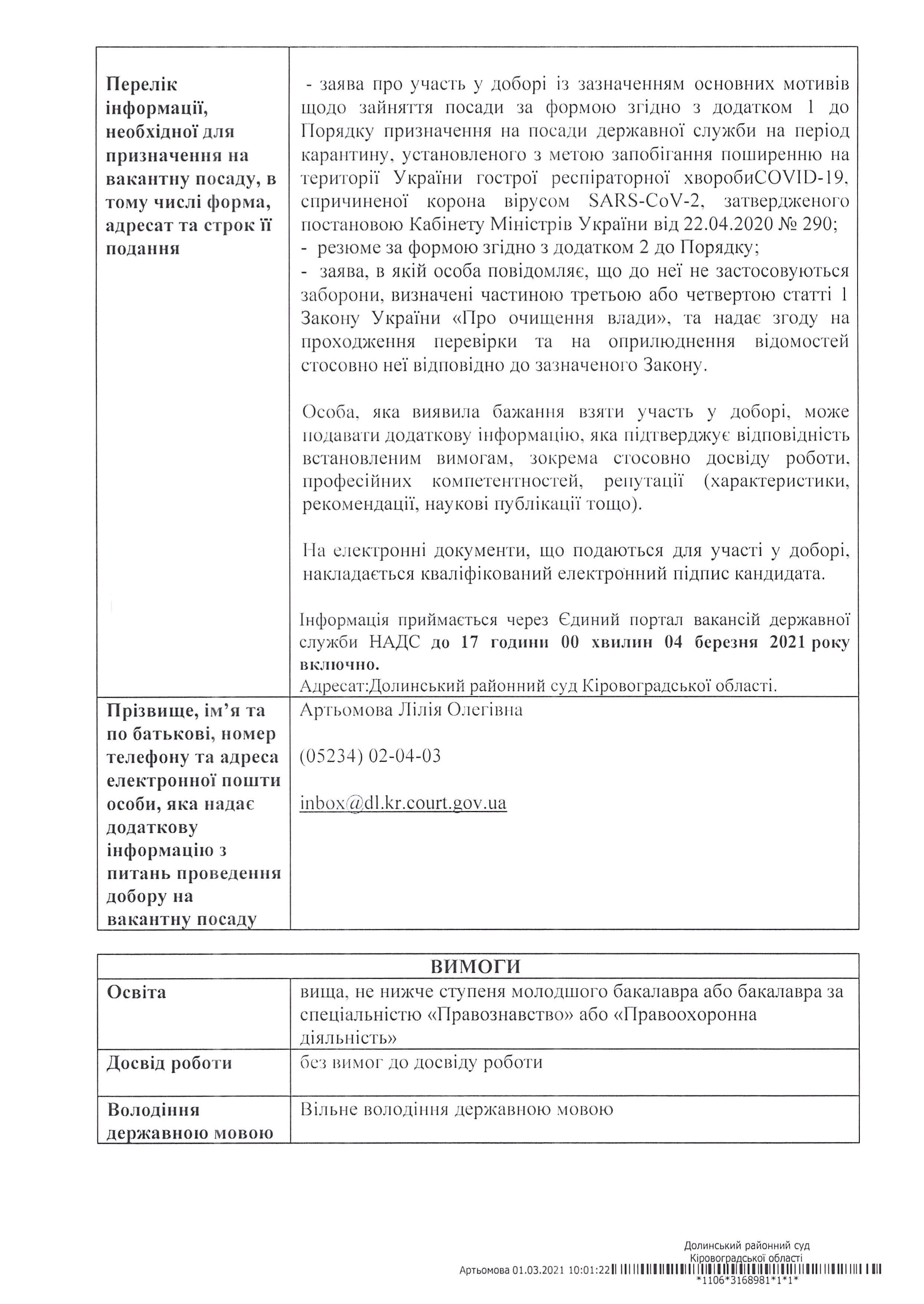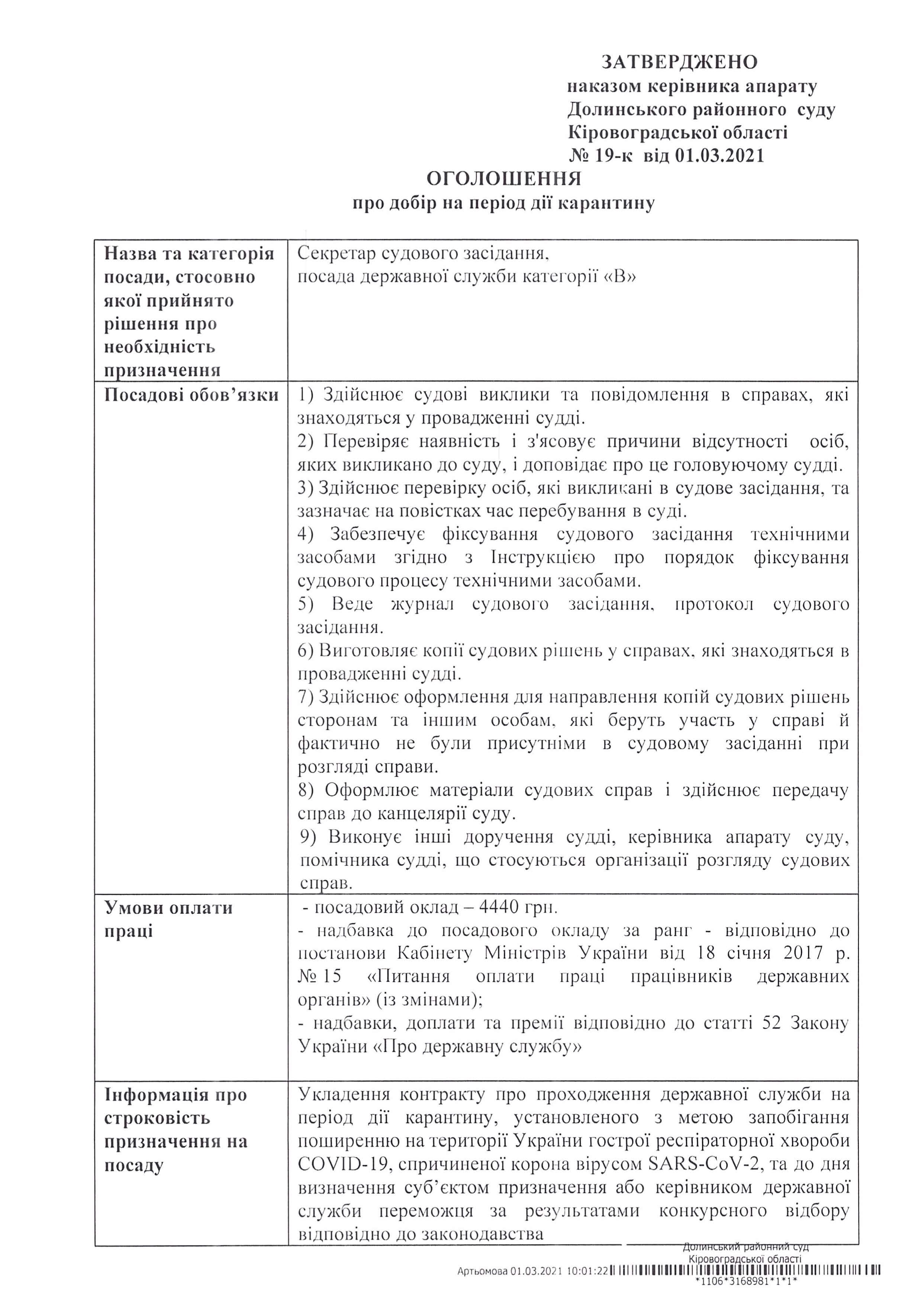Оголошення добору з призначення на тимчасову вакантну посаду державної служби категорії "В" - секретаря судового засідання.