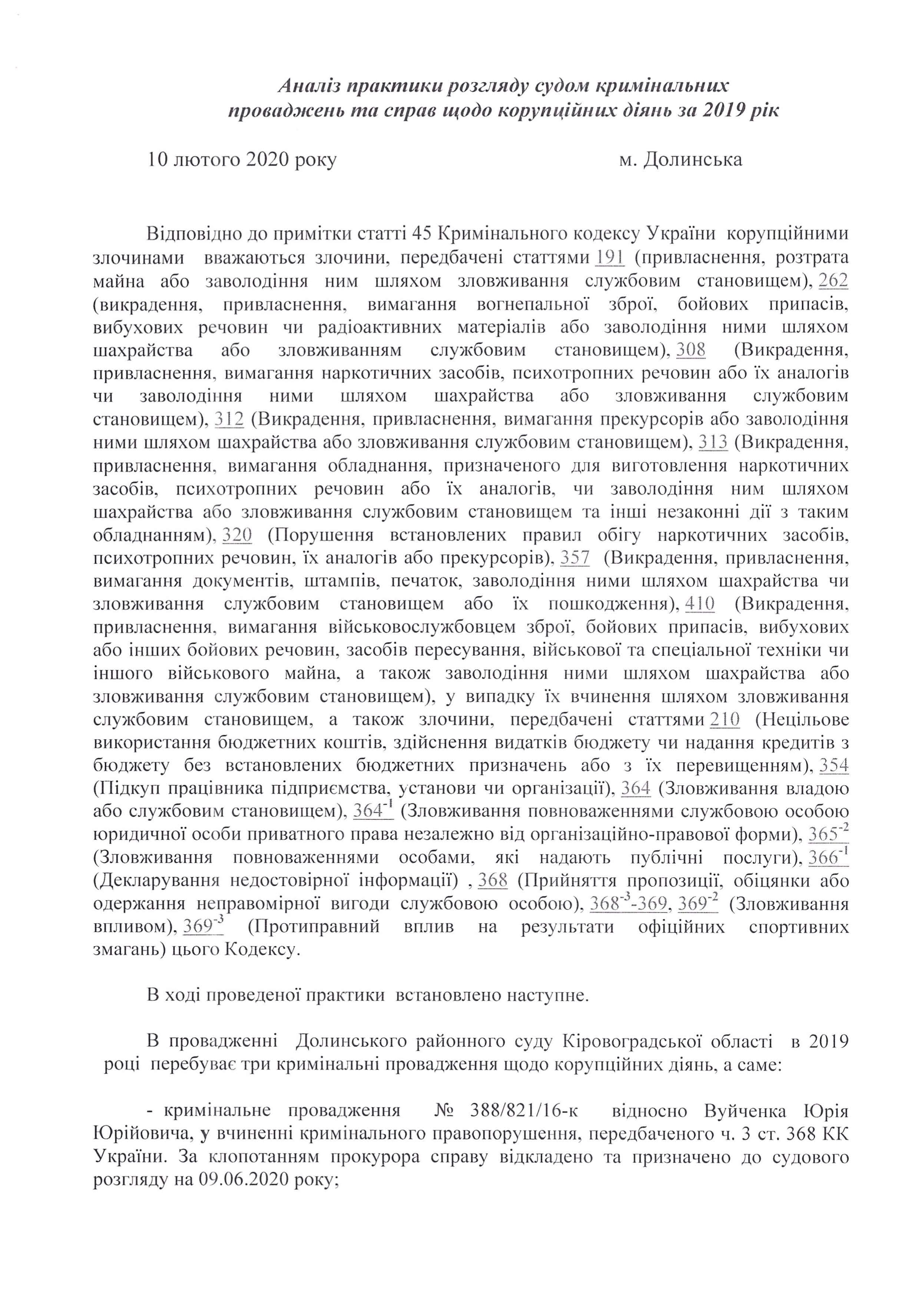 Аналіз практики розгляду судом кримінальних проваджень та справ щодо корупційних діянь за 2019 рік: