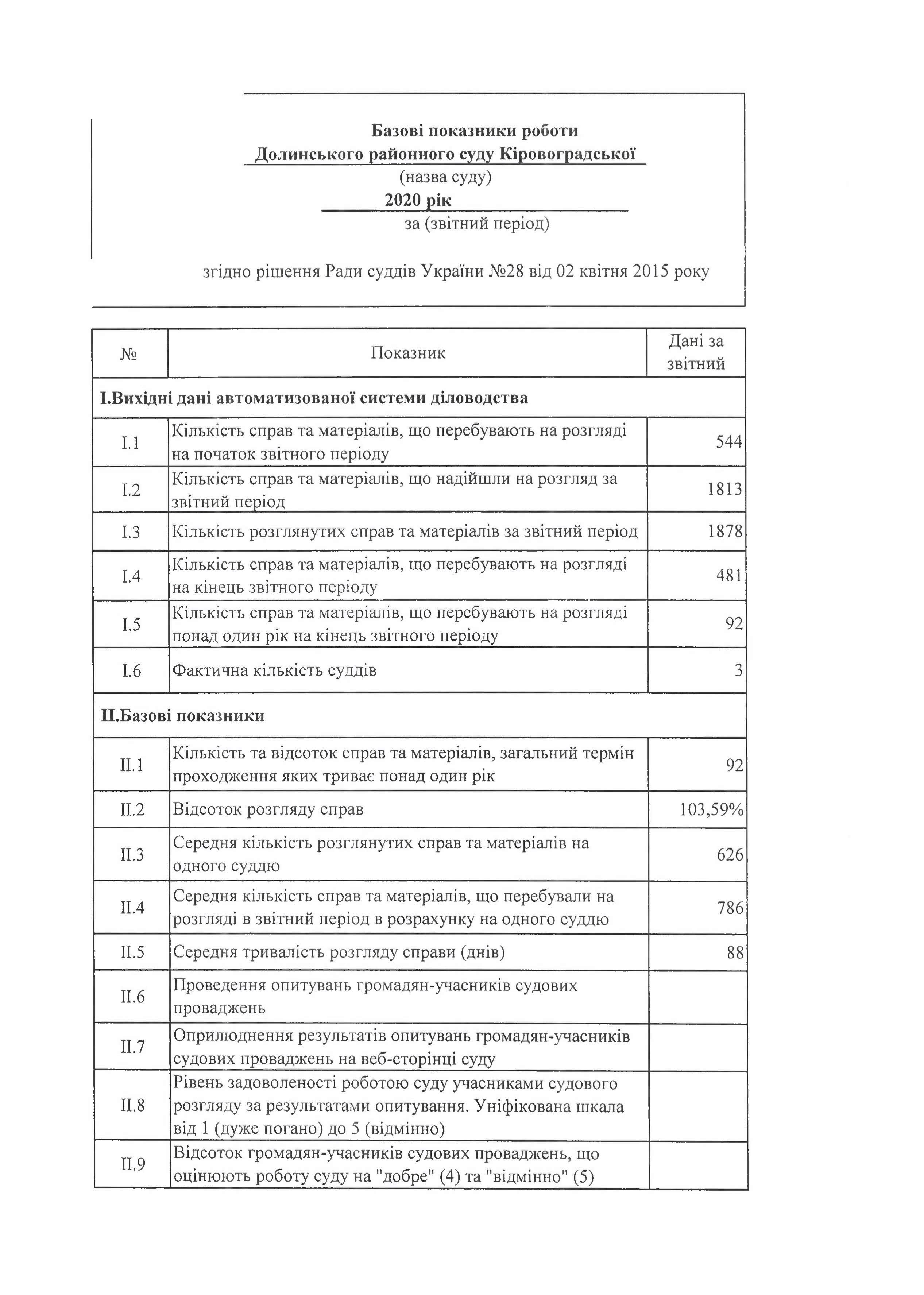 Базові показники роботи Долинського районного суду Кіровоградської області суду за 2020 рік. (Згідно рішення Ради суддів України №28 від 02 квітня 2015 року.)
