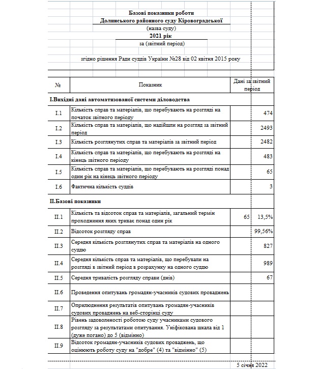 Базові показники роботи Долинського районного суду Кіровоградської області за 2021
