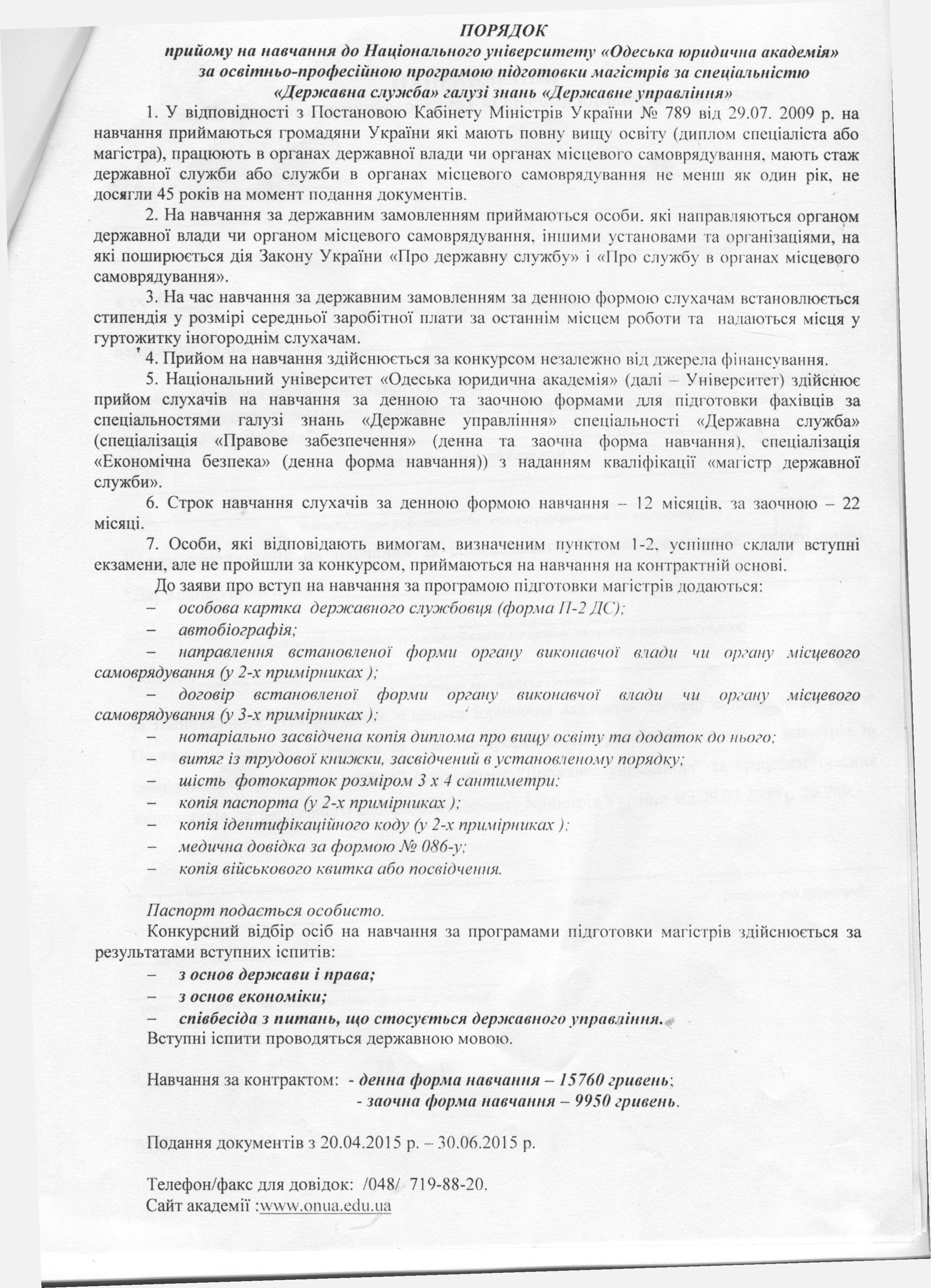 Порядок прийому на навчавння до Національного університету "Одеська юридична академія" за освітньо-професійною програмою підготовки магістрів за спеціальністю "Державна служба" галузі знань "Дердавне управління"