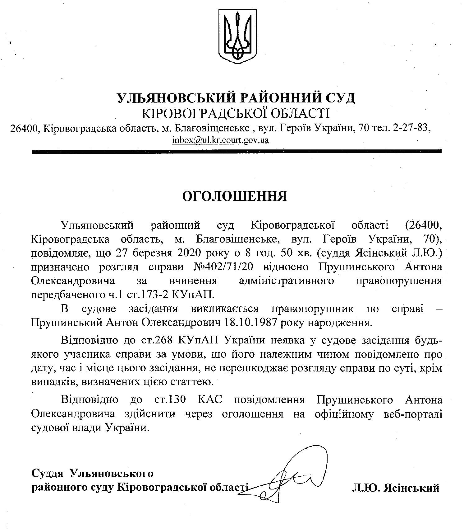 Прушинський Антон Олександрович викликається до Ульяновського районного суду Кіровоградської області