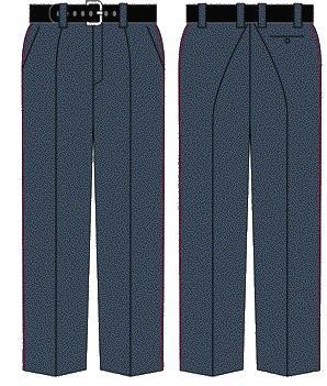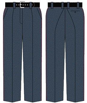 Брюки (рис. 2). Навипуск, прямого силуету. Виготовляються з напіввовняної тканини зеленого кольору з пришивним поясом, який застібається на праву сторону на петлю і пластиковий ґудзик та двома бічними (із підрізним бочком) потайними кишенями попереду. У шві середнього полотнища оброблена застібка, яка застібається на тасьму "блискавка" або на петлі і ґудзики. Позаду, на правій задній половині полотнища вшито одну прорізну кишеню, яка застібається на петлю і ґудзик з амінопласту. Пояс оброблений корсажною стрічкою та має шість шлівок для ременя. По боках брюки оздоблені кантами крапового кольору шириною 1,5 мм.