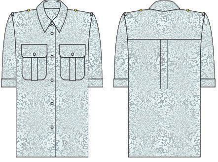 Сорочка з довгим рукавом (рис. 4). Виготовляється з напівбавовняної тканини сіро-сталевого кольору світлого відтінку. Силует прямий. Застібається на праву сторону на шість пластикових ґудзиків світло-сірого або світло-голубого кольору. На пілочках - дві накладні нагрудні кишені із рівними клапанами, що застібаються до низу на прорізні петлі та ґудзики. Кишені з двома застроченими складками. Рукав довгий, ушитий, одношовний з манжетом, що застібається на один ґудзик. Комір відкладений із гострими кінцями. Спинка на кокетці з двома складками, розташованими у шві пришивання кокетки. На плечових швах пришито хлястики (контрпогони) та формені металеві ґудзики малого розміру для кріплення наплічних знаків розрізнення.