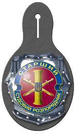 Нагрудний службовий знак (рис. 23). Являє собою зображення емблеми служби судових розпорядників розміром 70 х 63 мм на емалевому тлі крапового кольору в обрамленні декоративної стрічки синього кольору з написами літерами жовтого кольору "СТАРШИЙ СУДОВИЙ РОЗПОРЯДНИК" (рис. 23-а) та "СУДОВИЙ РОЗПОРЯДНИК" (рис. 23-б). Композицію накладено на стилізоване зображення захисного обладунку кіраси, виготовленої з білого металу. Нагрудний службовий знак кріпиться до підкладки з чорної натуральної шкіри, за допомогою якої він кріпиться до ґудзика лівої кишені мундирної куртки.