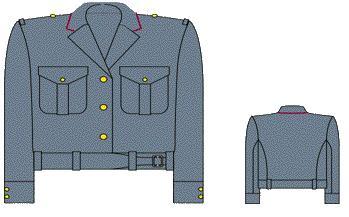 Мундирна куртка (рис. 8). Виготовляється з напіввовняної тканини зеленого кольору, на підкладці. Силует вільний, на поясі звужений. На поясі куртки нашиваються шість шлівок для кріплення декоративного пояса. Пояс декоративний накладний від швів з'єднання пояса пілочки і бокових частин пояса, з напіввовняної тканини зеленого кольору, шириною 50 мм і має спереду хлястик та ф-подібну пряжку з амінопласту сірого кольору для регулювання повноти в талії. На пілочках куртки нашиваються нагрудні накладні кишені із фігурними клапанами, оздоблені бантовою складкою. Мундирна куртка однобортна, застібається на ліву сторону на три формених металевих ґудзики середнього розміру. Комір оздоблений кантом крапового кольору шириною 1,5 мм. По боках задньої спинки два шва. Рукав ушитий, двошовний з манжетом та шліцею по ліктьовому шву. Манжет оздоблено кантом крапового кольору шириною 1,5 мм та двома форменими металевими ґудзиками малого розміру. На плечових швах пришито по два хлястики (контрпогони) та два формених металевих ґудзика малого розміру для кріплення наплічних знаків розрізнення.