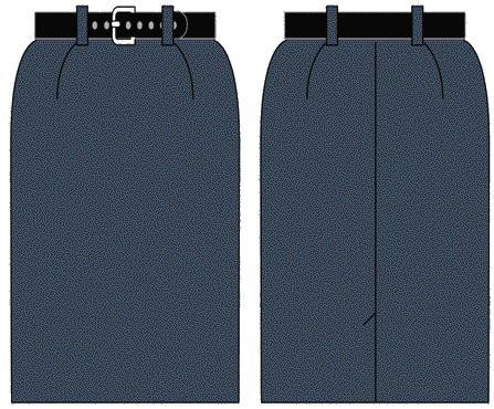 Спідниця (рис. 9). Виготовляється з напіввовняної тканини зеленого кольору, на підкладці. Пряма, тришовна з пришивним поясом із вставленою еластичною стрічкою, який застібається на петлю і пластиковий ґудзик. Переднє та заднє полотнища з двома виточками на кожному. Заднє полотнище зі швом посередині, який закінчується щліцом. У шві заднього полотнища оброблена застібка на тасьму "блискавка". Пояс оброблений корсажною стрічкою та має чотири шлівки для ременя.