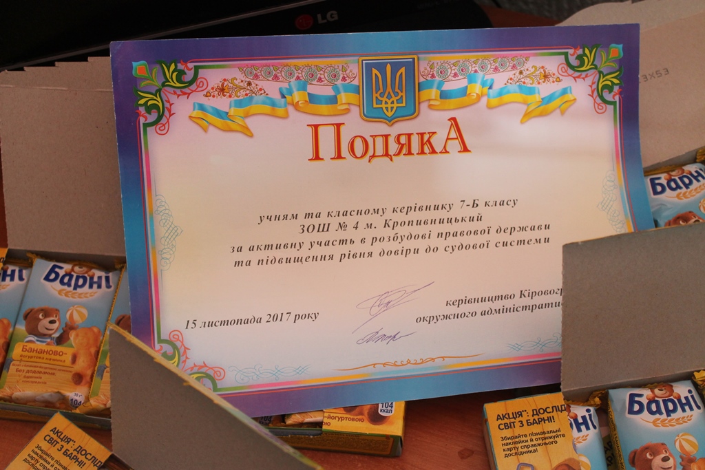 Так, сьогодні, 15 листопада 2017 року з метою зміцнення авторитету судової влади та підвищення довіри громадян до судової системи, Кіровоградський окружний адміністративний суд запросив на екскурсію учнів 7-Б класу ЗОШ №4 м. Кропивницького зі своїм класним керівником.