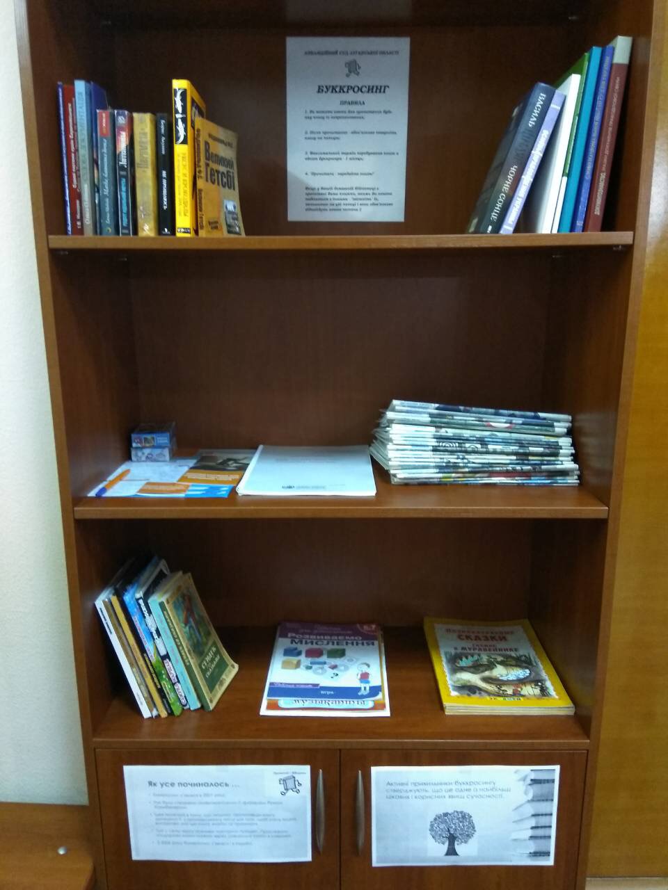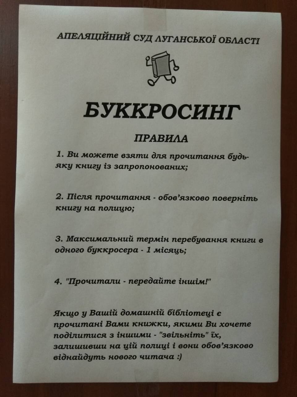 Апеляційний суд Луганської області долучився до всесвітнього руху звільнення книжок, від тепер у приміщенні для відвідувачів суду, на 1-му поверсі, в холлі розташована буккросинг-полиця.