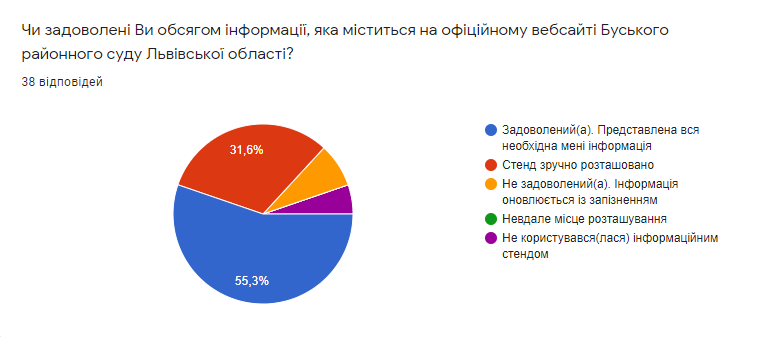 Враховуючи викладене, дане дослідження дало змогу з’ясувати, що діяльність Буського районного суду Львівської області отримало високу оцінку відвідувачів суду, яка є результатом щоденної та відповідальної роботи адміністрації суду, суддів та працівників апарату суду.