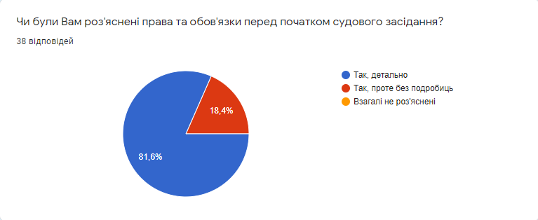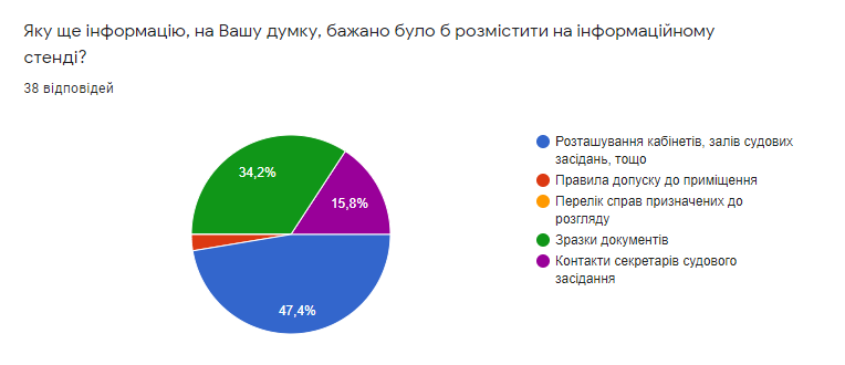 Всього в опитуванні прийняло участь 38 осіб, що на 18 респондентів менше в порівнянні з опитуванням 2019 року. Це пояснюється тим, що торік опитування проводилося за допомогою паперових анкет в приміщенні суду, а в 2020 році за допомогою Google Forms ( програмного забезпечення для адміністрування опитувань, яке входить до програмного забезпечення Google Docs Editors), а не кожен відвідувач суду є цифровообізнаним.