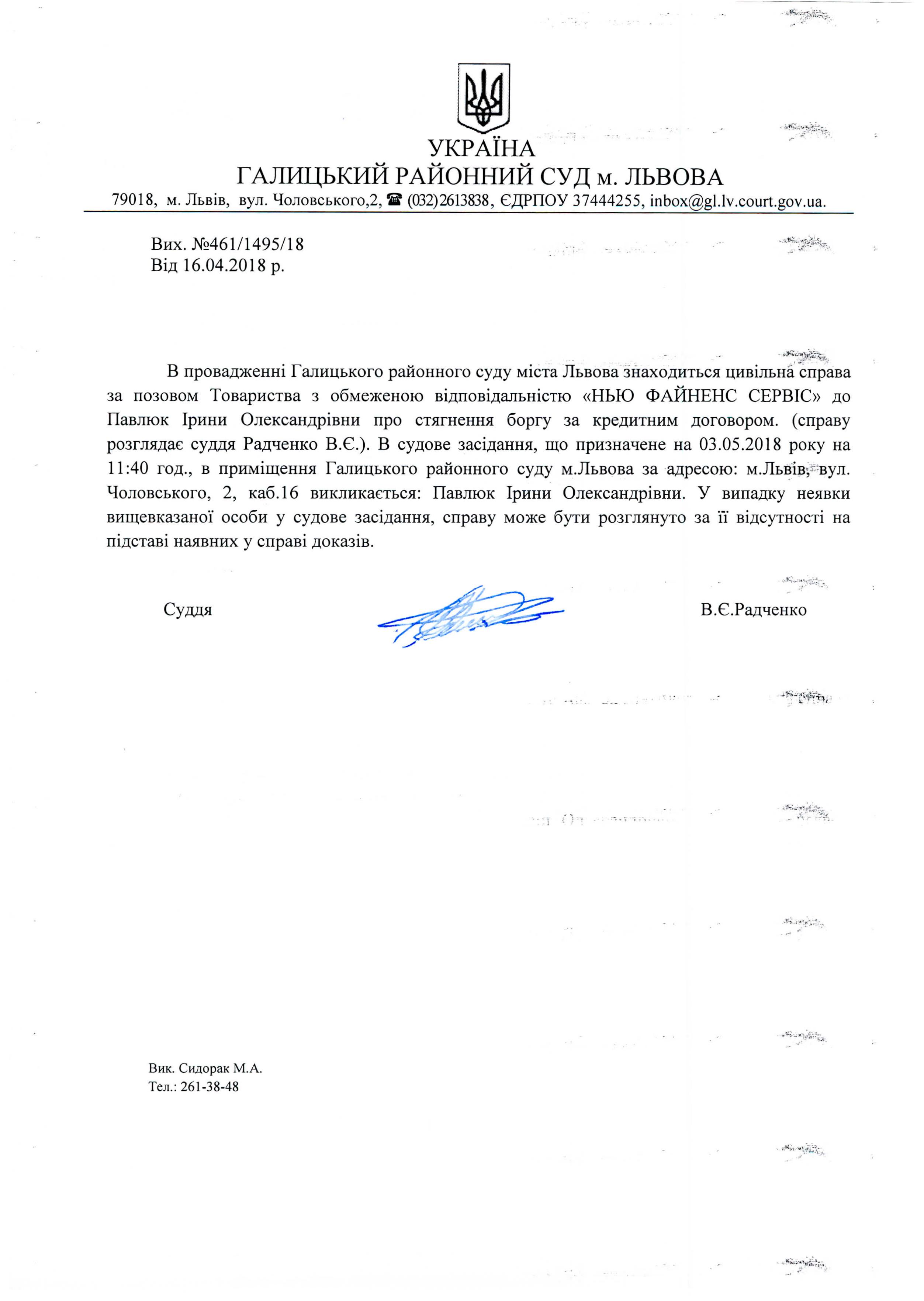 Оголошення про виклик до суду Павлюк Ірини Олександрівни