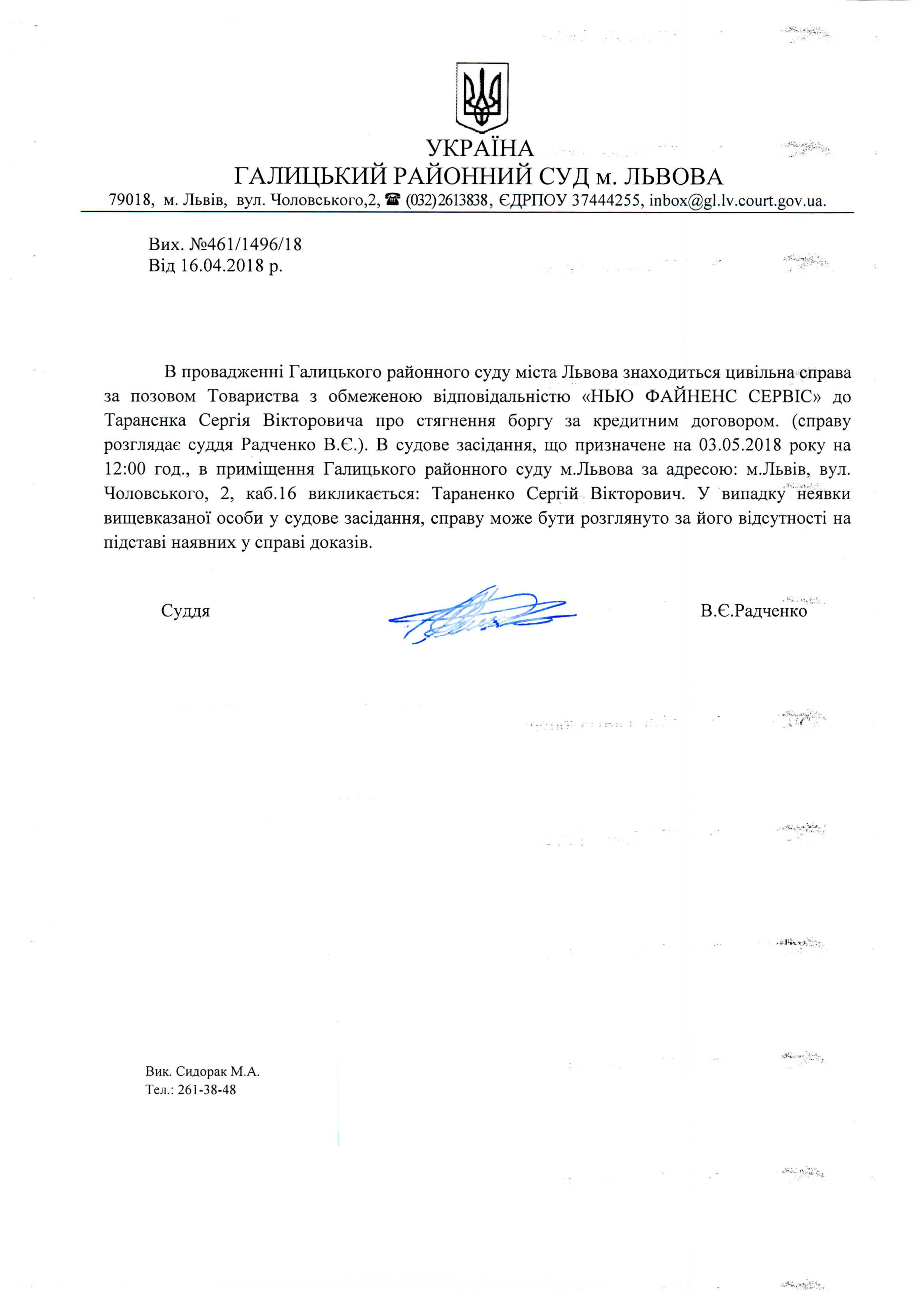 Оголошення про виклик до суду Тараненко Сергій Вікторович