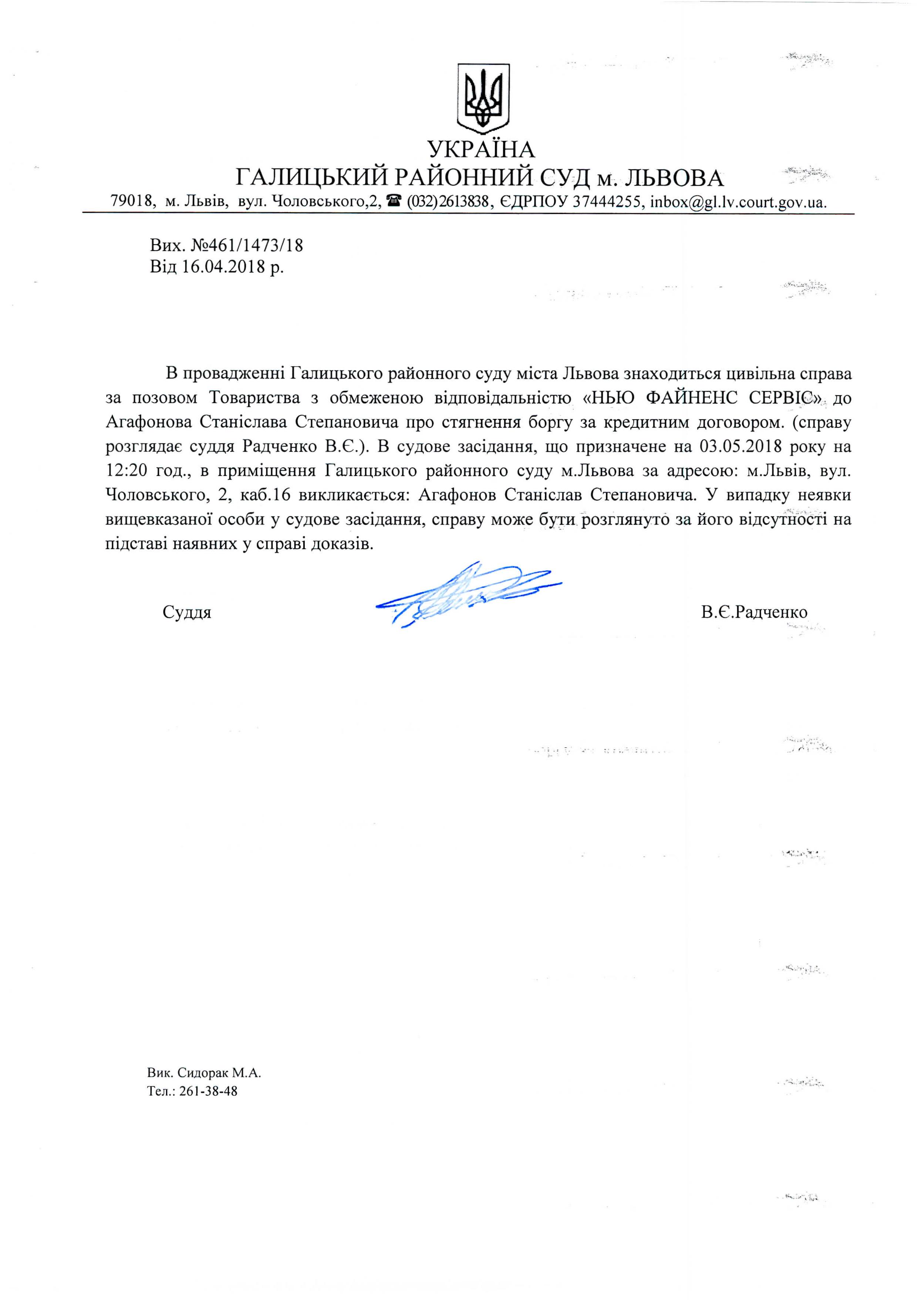 Оголошення про виклик до суду Агафонов Станіслав Степановича