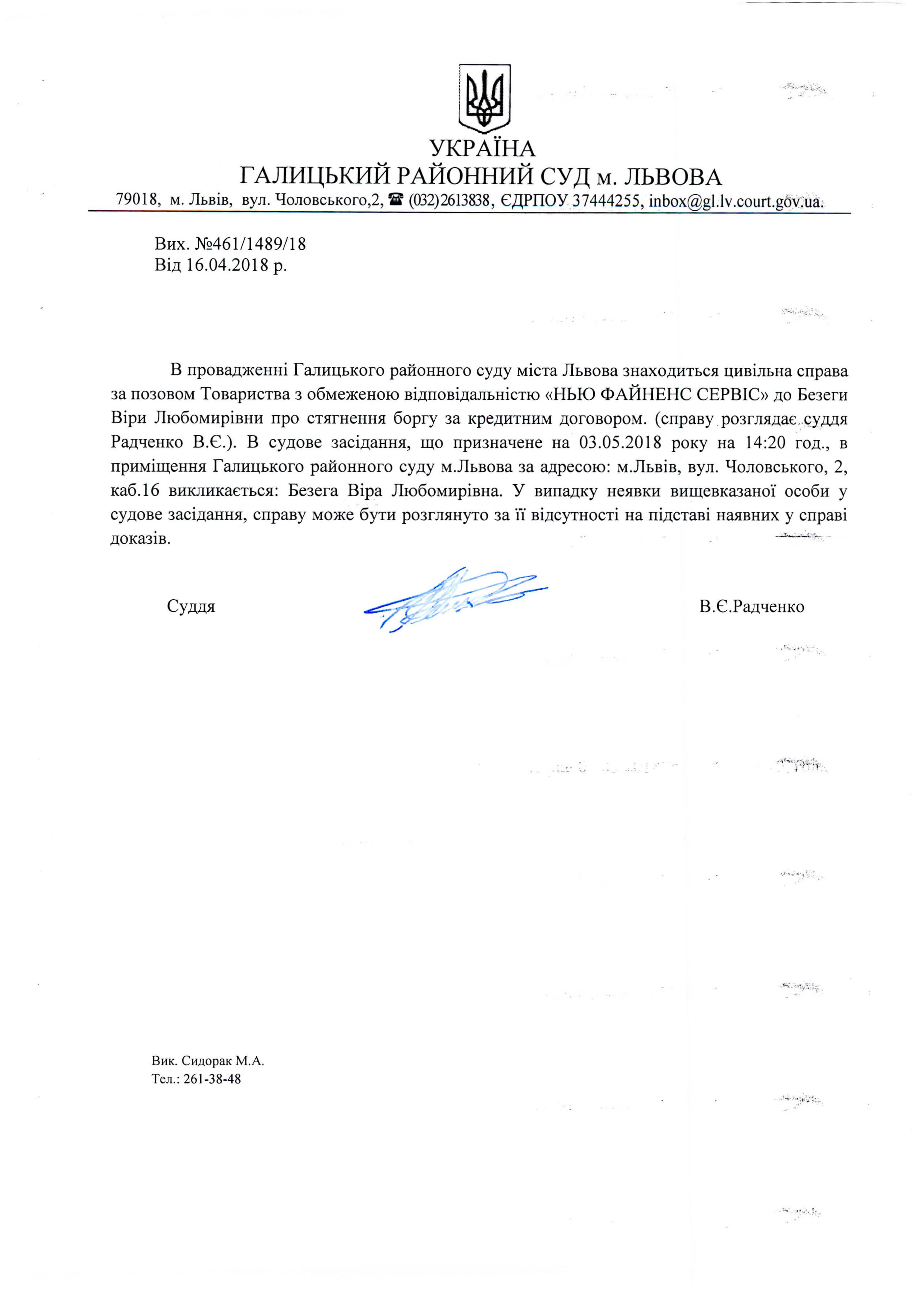 Оголошення про виклик до суду Безега Віра Любомирівна