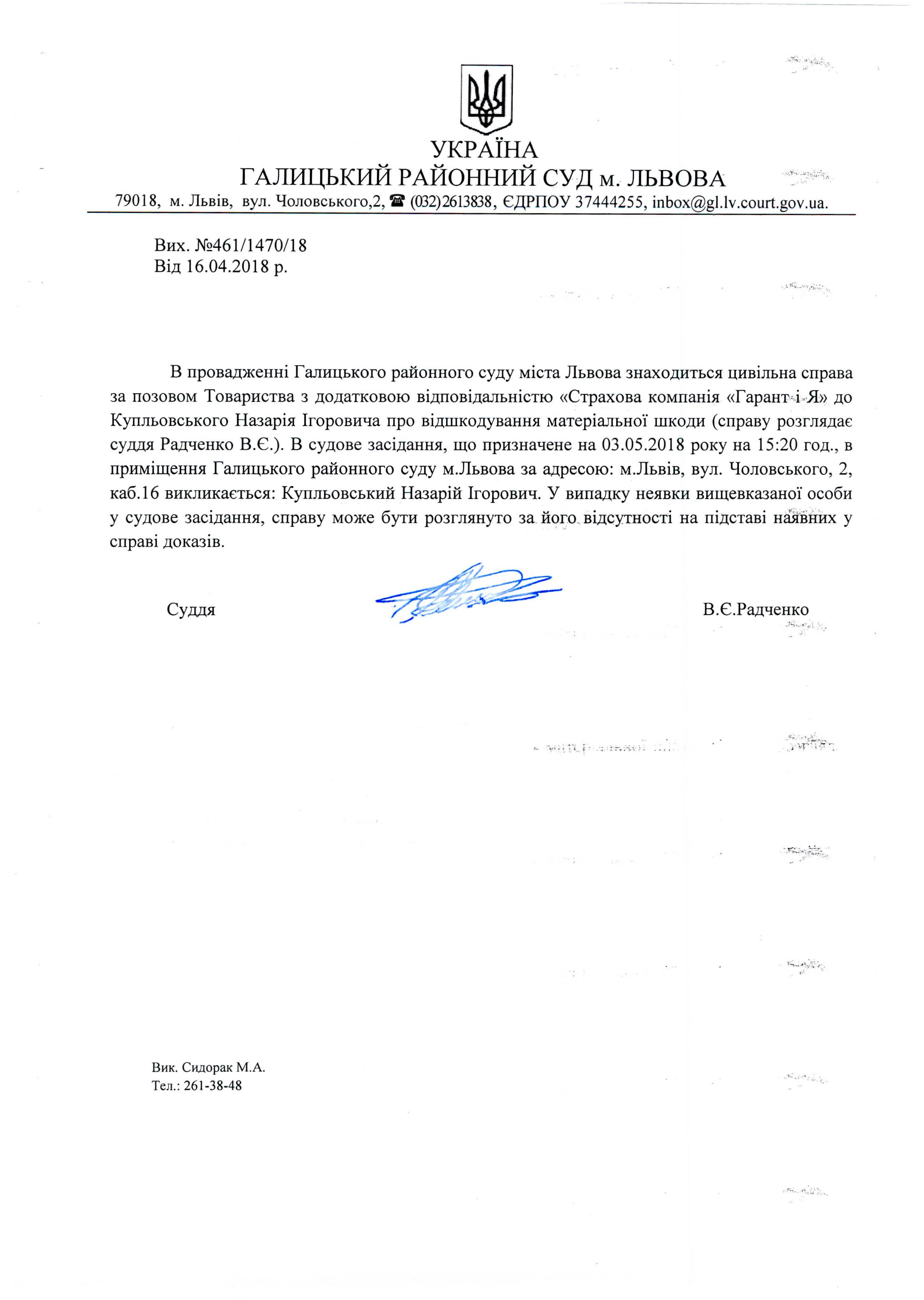 Оголошення про виклик до суду Купльовський Назарій Ігорович