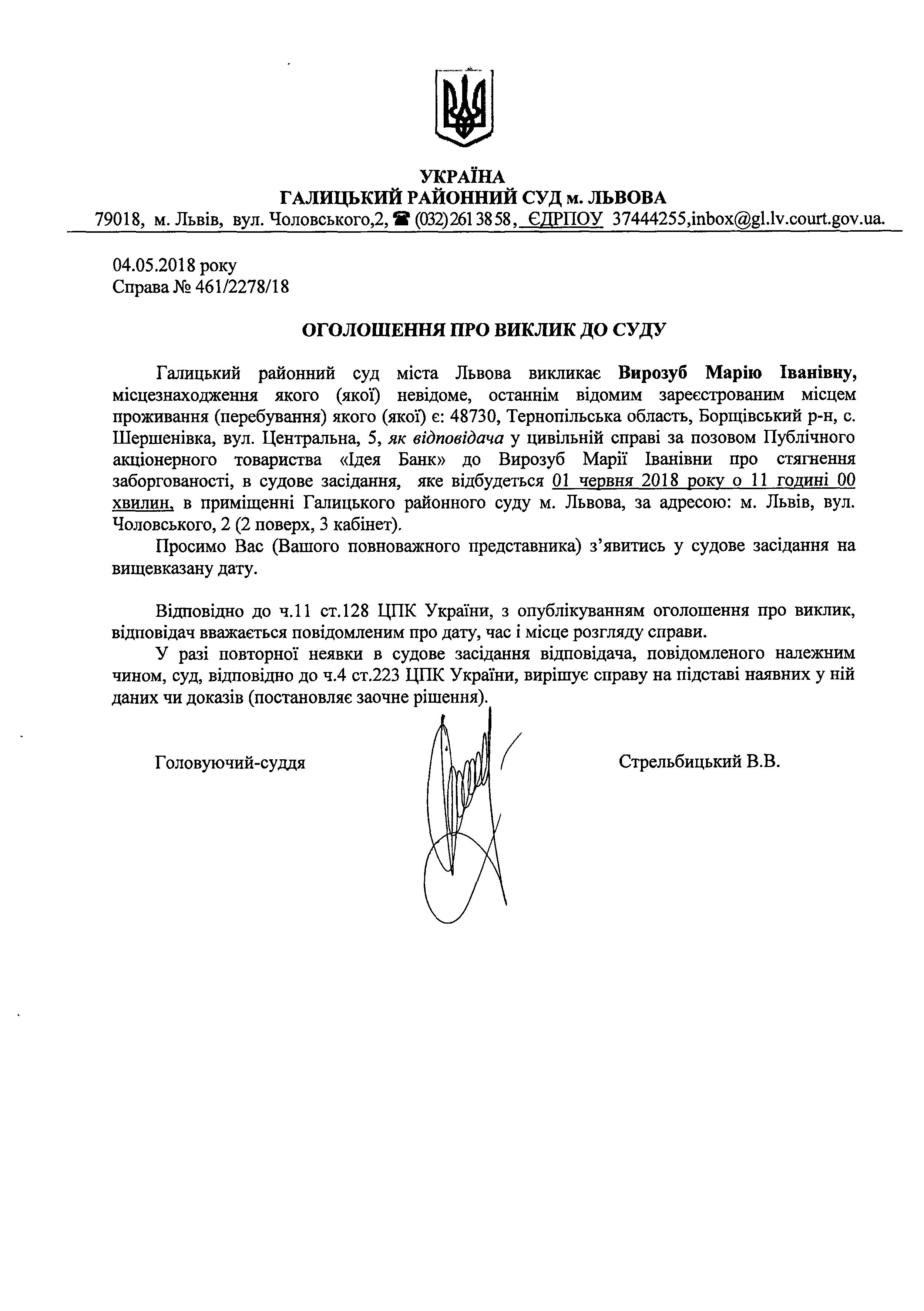 Оголошення про виклик до суду Вирозуб Марію Іванівну