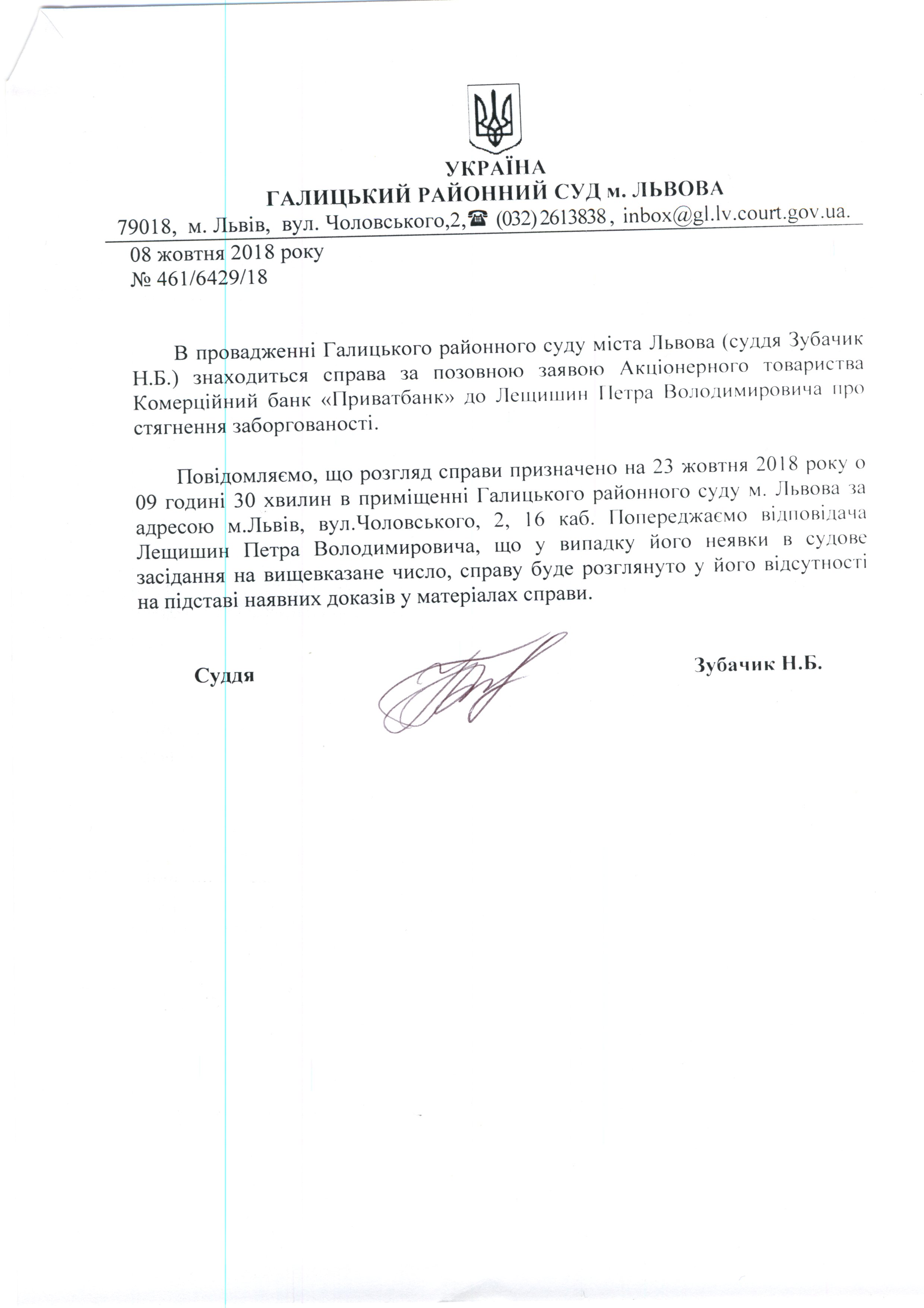 Оголошення про виклик до суду Лещишин Петра Володимировича