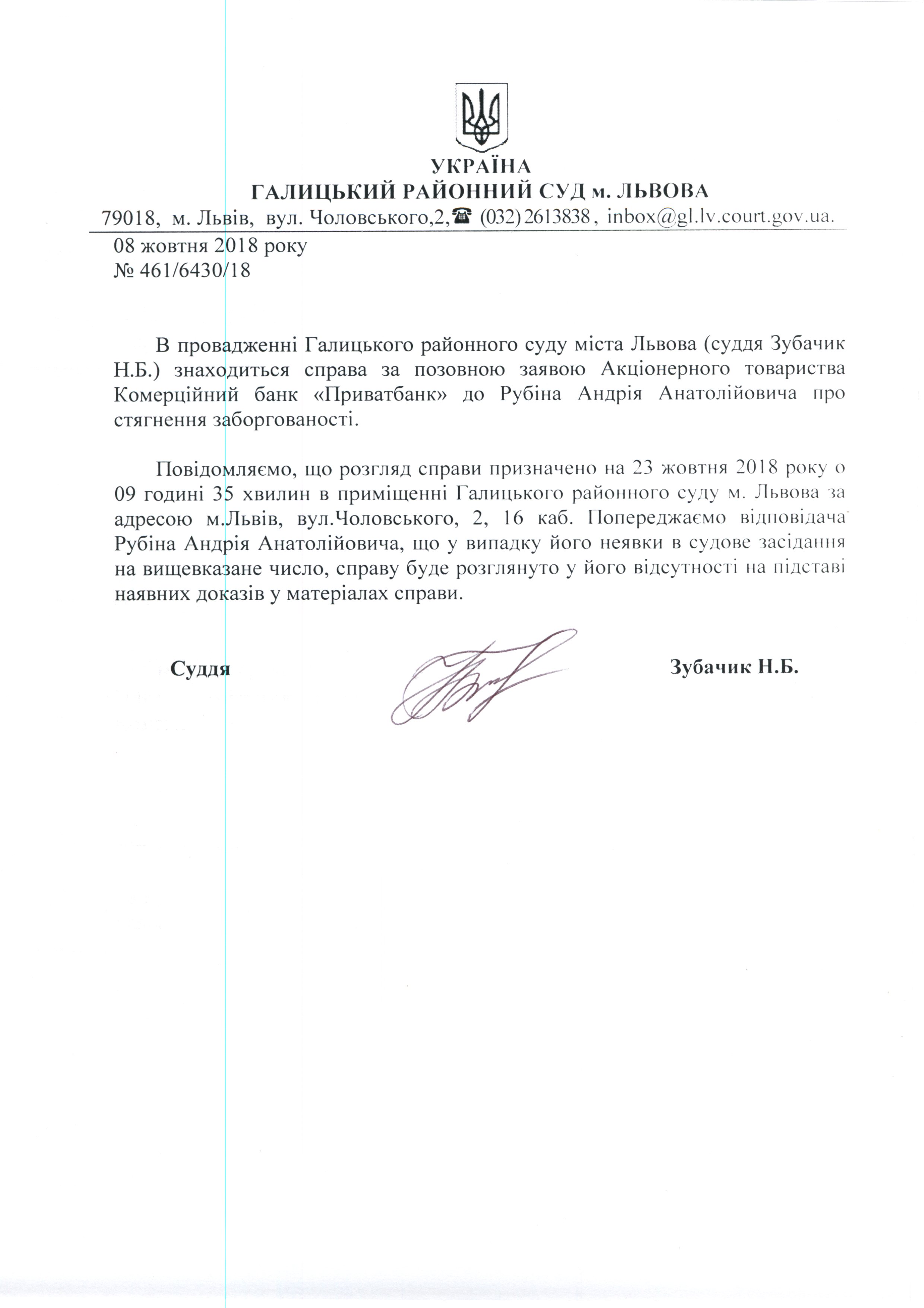 Оголошення про виклик до суду Рубіна Андрія Анатолійовича
