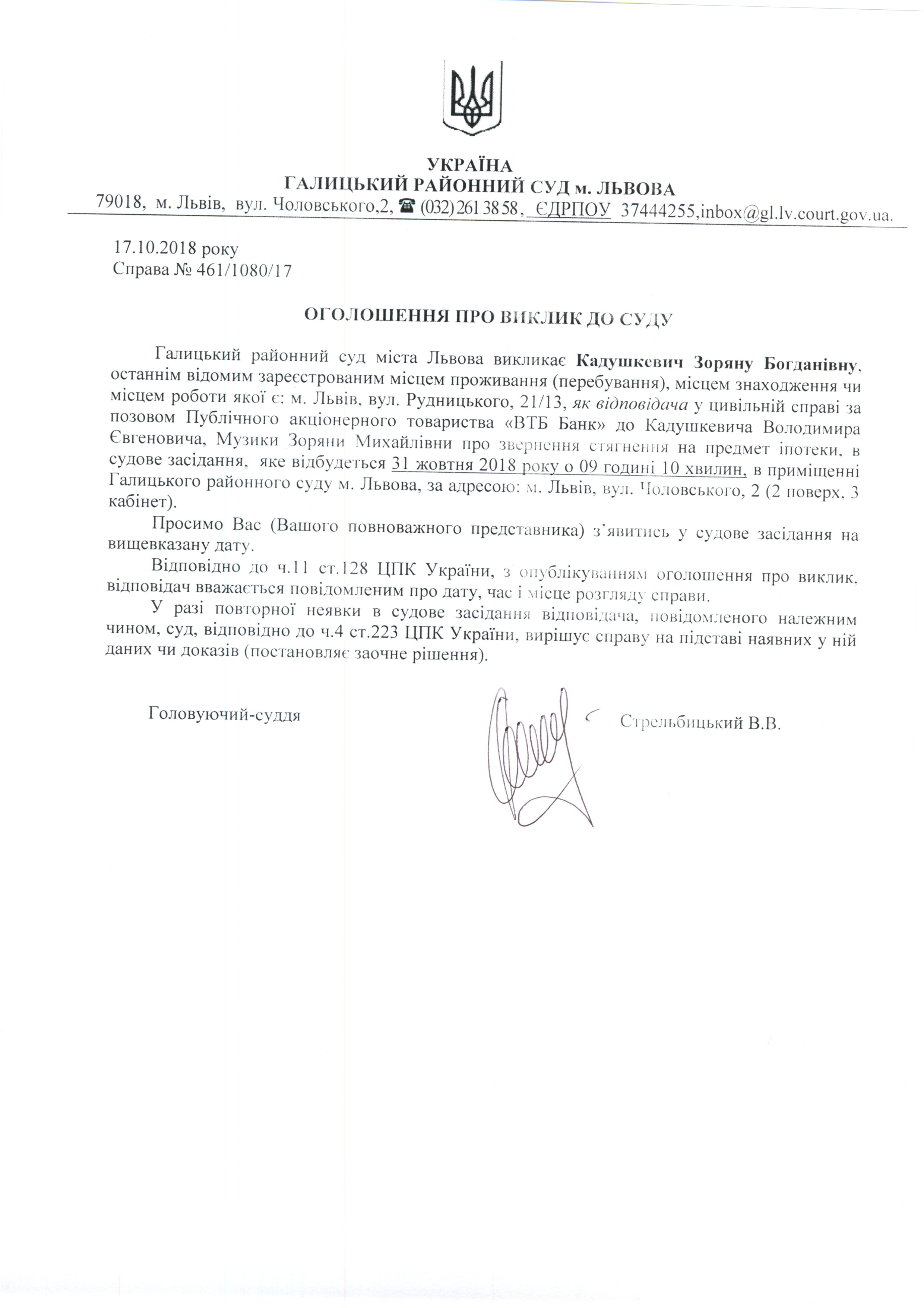 Оголошення про виклик до суду Кадушкевич Зоряни Богданівни