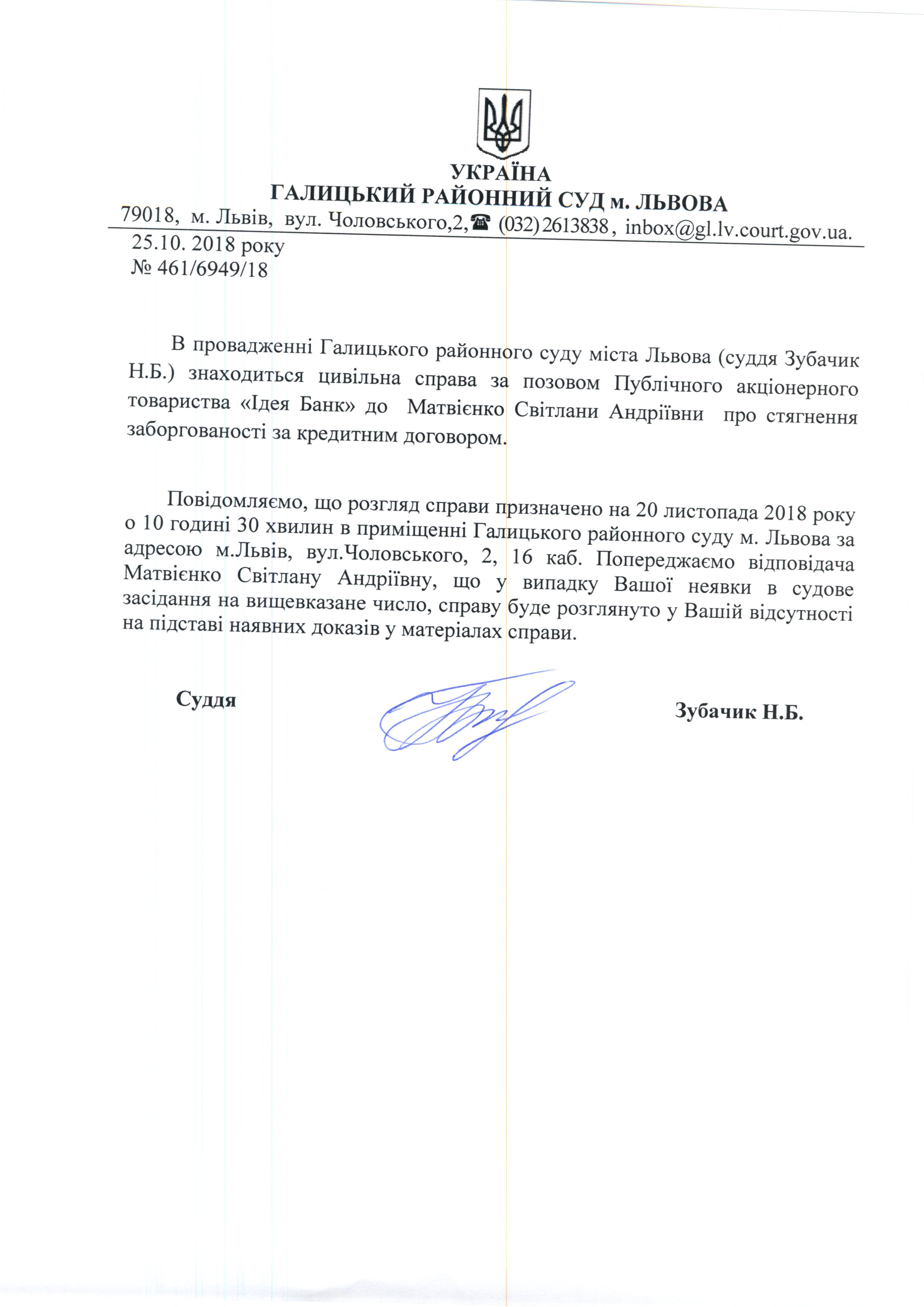 Оголошення про виклик до суду Матвієнко Світлани Андріївни