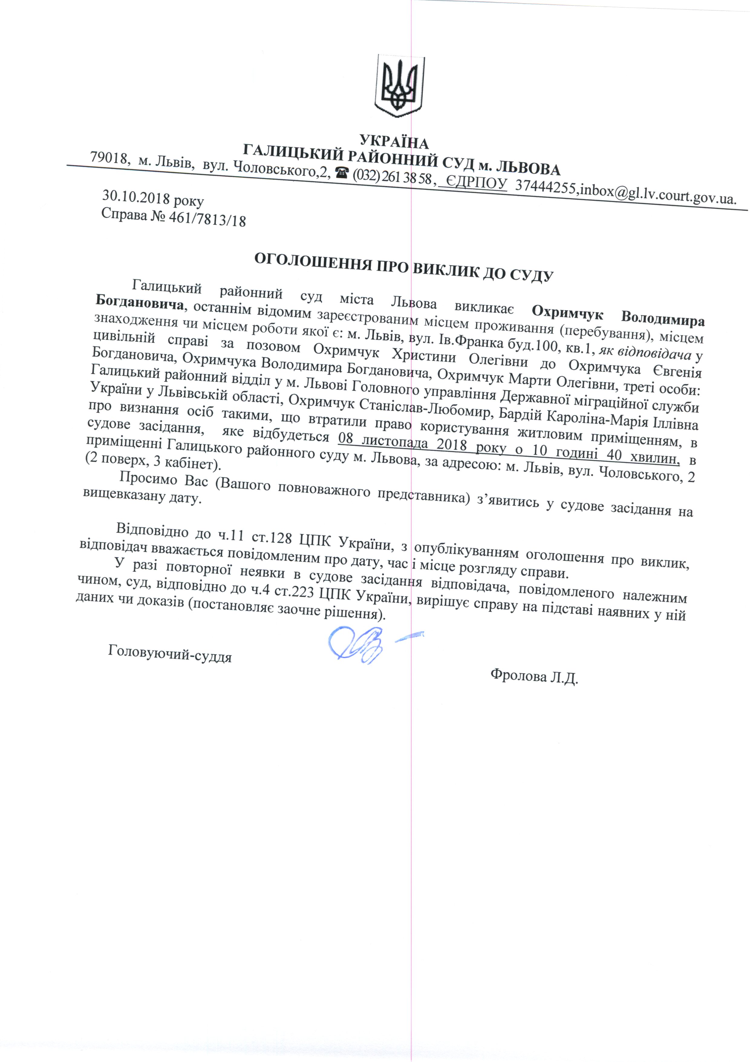 Оголошення про виклик до суду Охримчук Володимира Богдановича