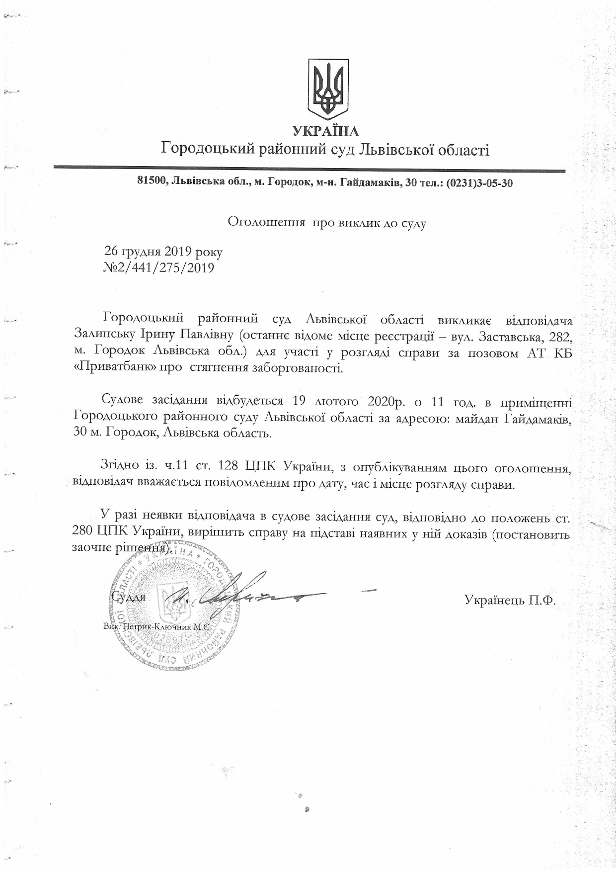 Оголошення про виклик до суду