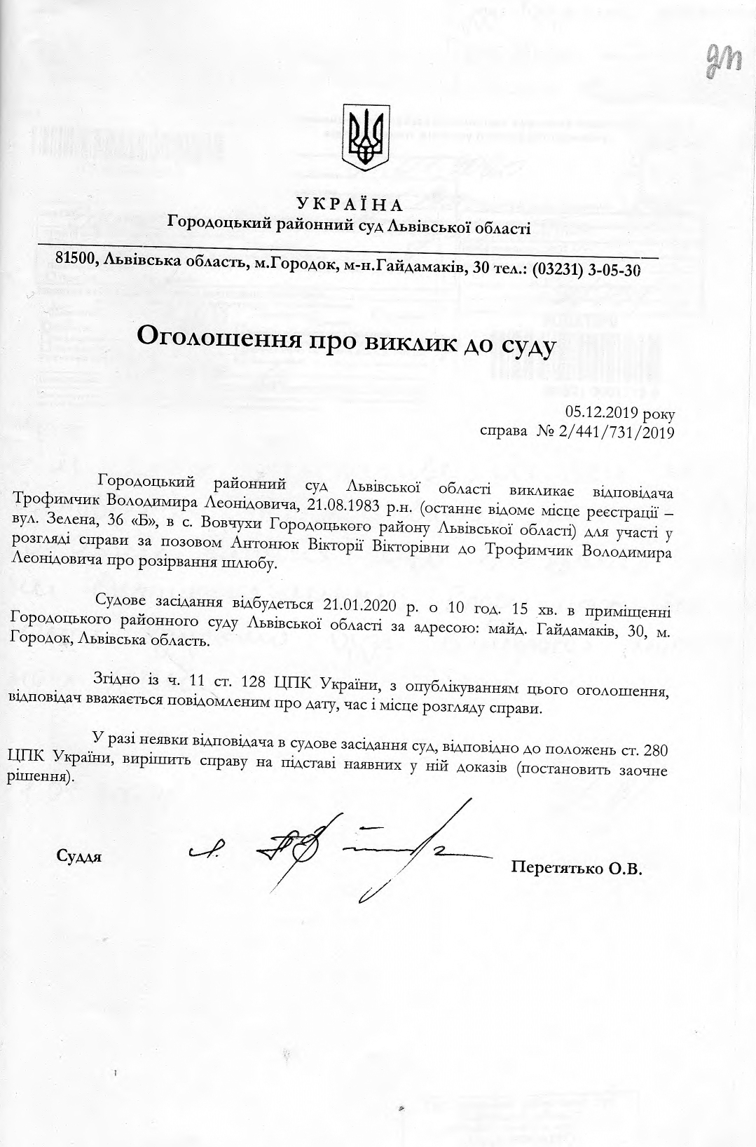 Оголошення про виклик до суду