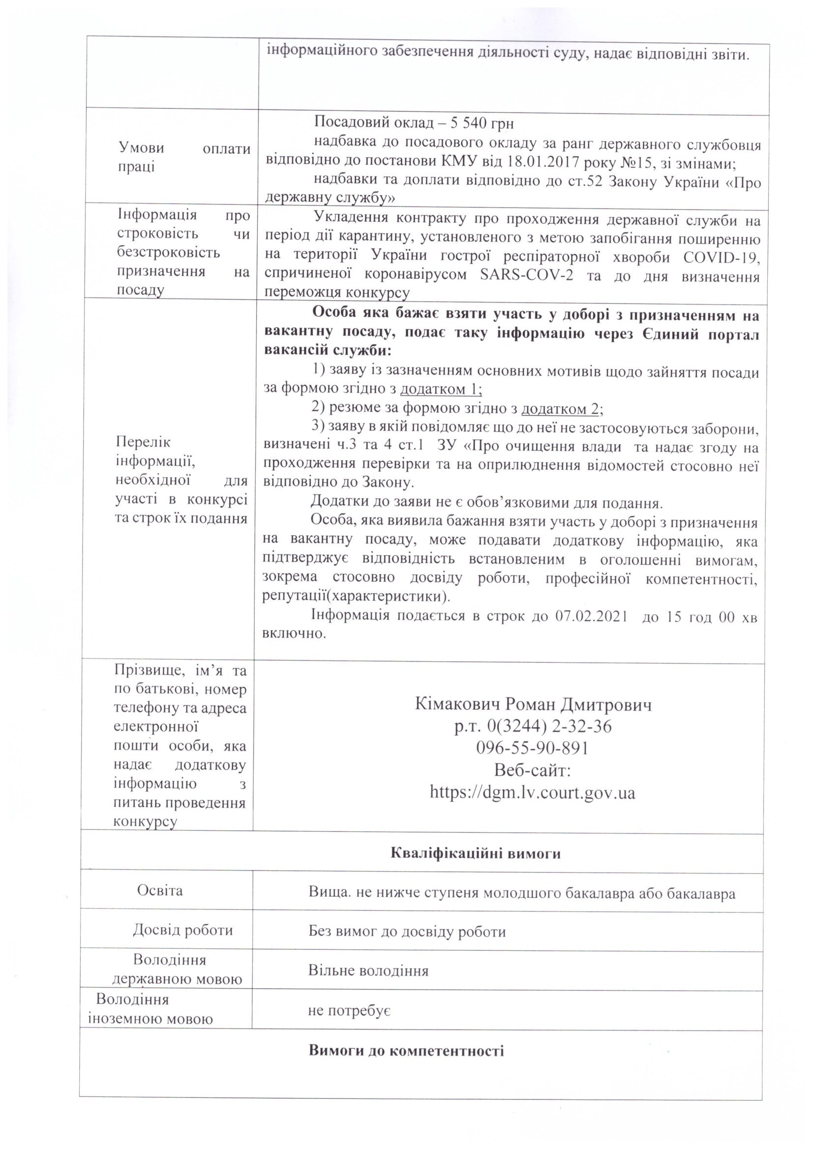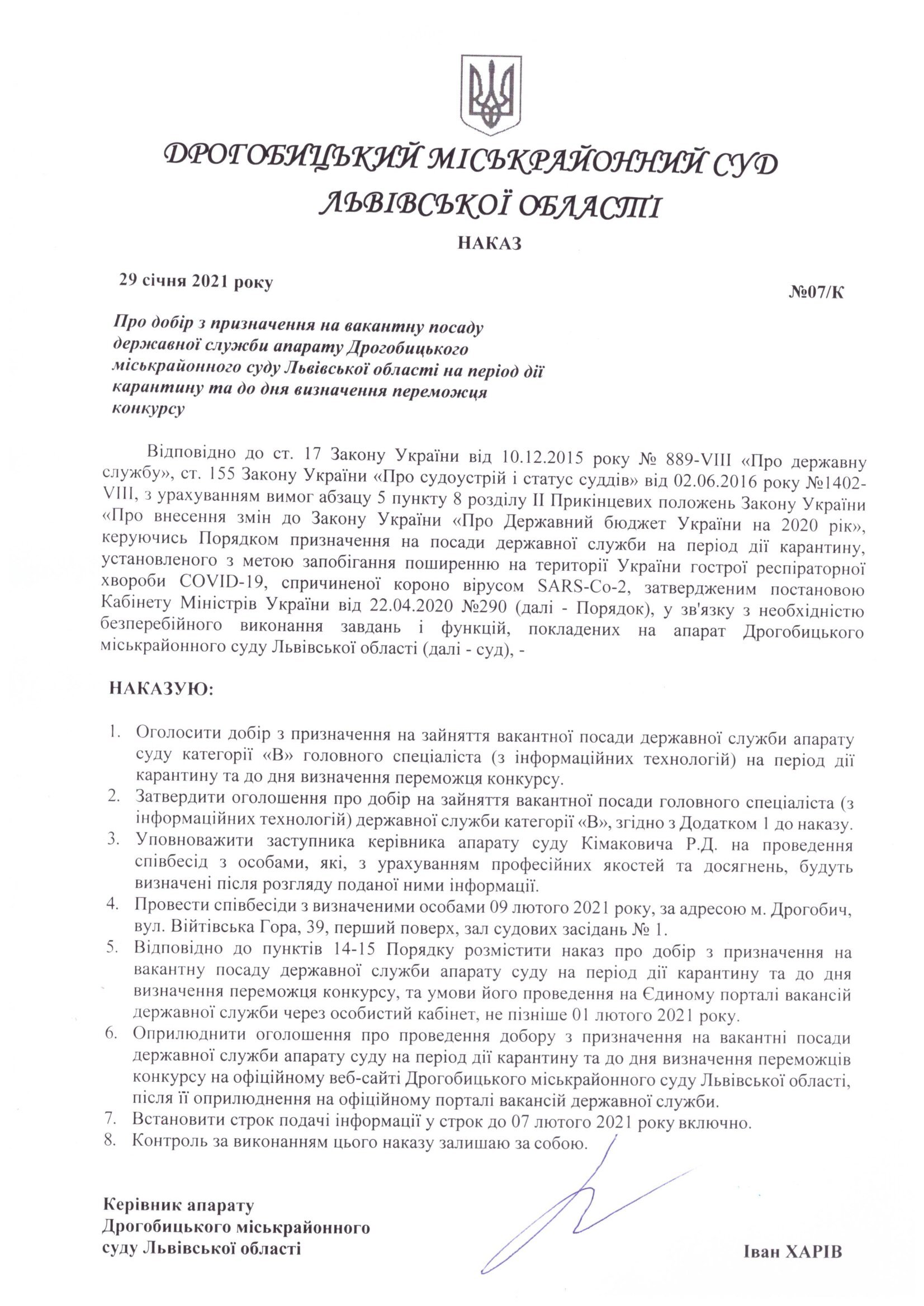 Наказ про оголошення добору з призначення на вакантні посади державної служби категорії "В" в апараті суду