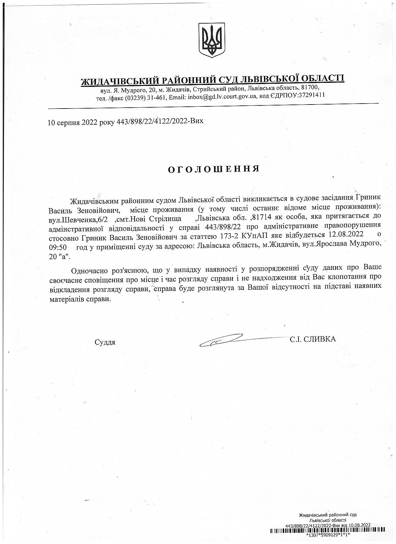 Оголошення про виклик до суду Гриник В.З.