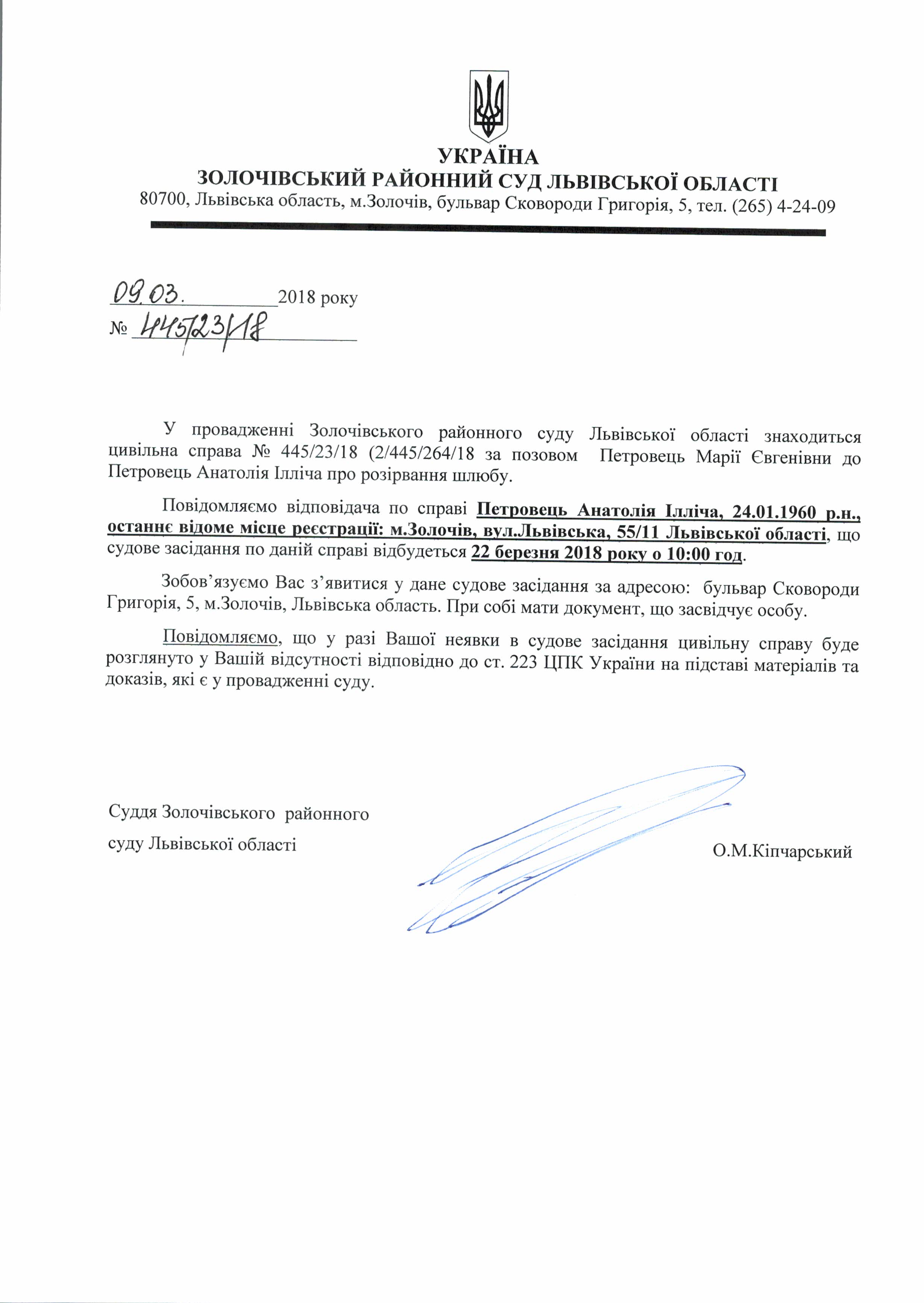 Оголошення про виклик в судове засідання Петровець А.І. відповідача по справі № 445/23/18 на 22.03.2018 року о 10:00 год.
