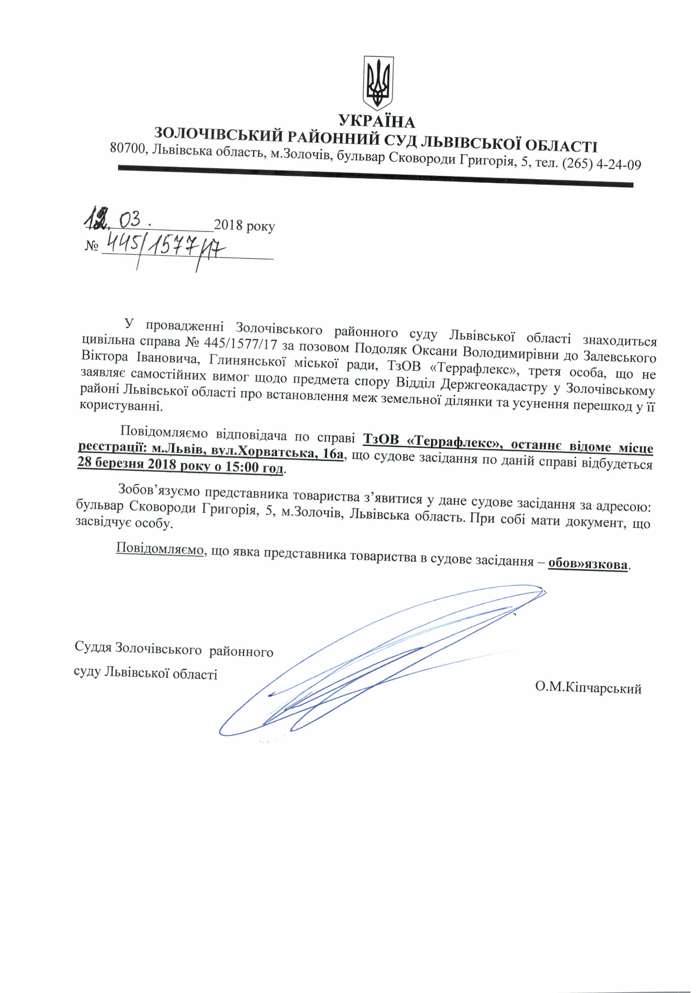 Оголошення про виклик в судове засідання ТзОВ "Террафлекс" відповідача по справі № 445/1577/17 на 28.03.2018 року о 15:00 год.