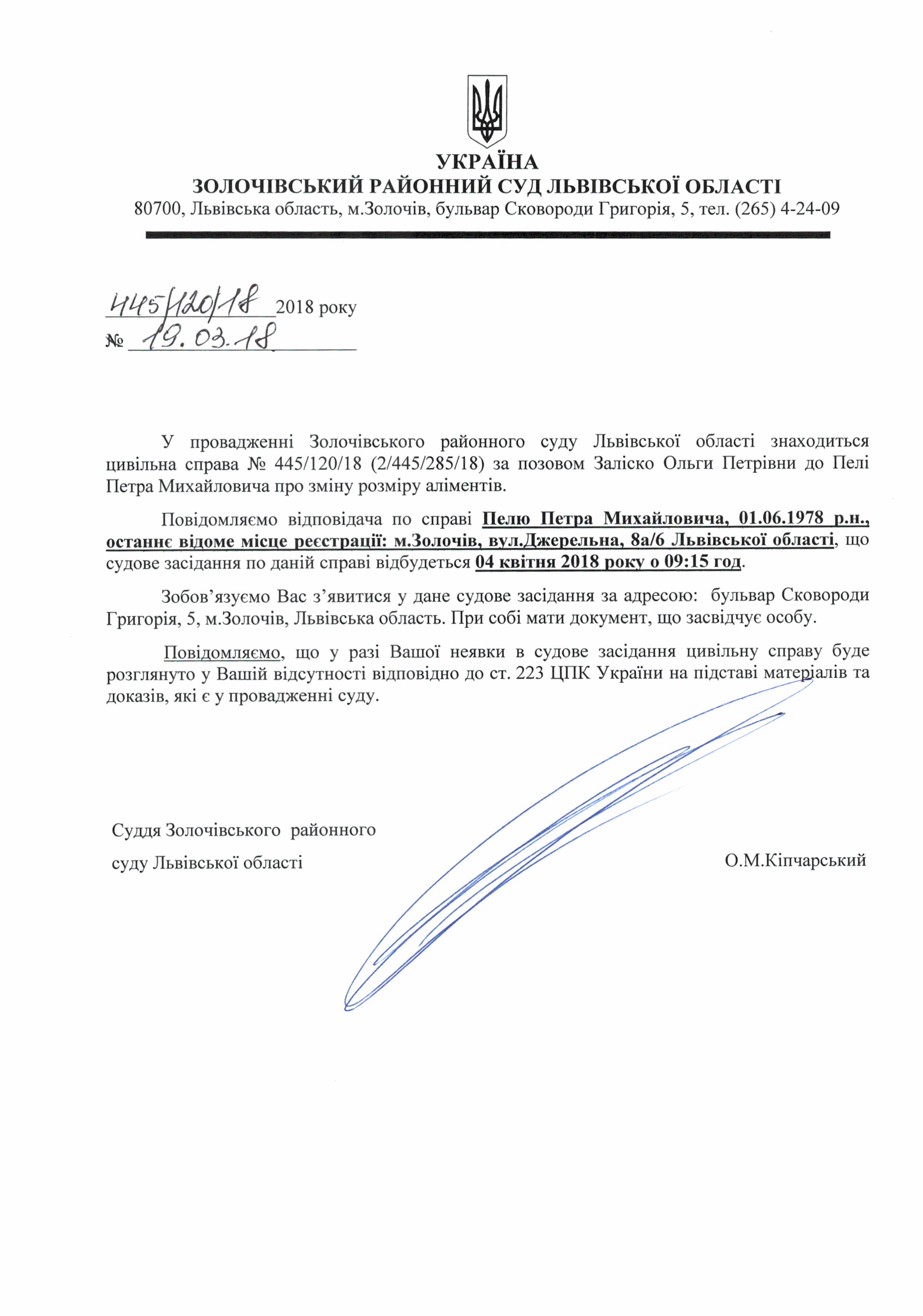 Оголошення про виклик в судове засідання Пелю П.М. відповідача по справі № 445/120/18 на 04.04.2018 року о 09:15 год.