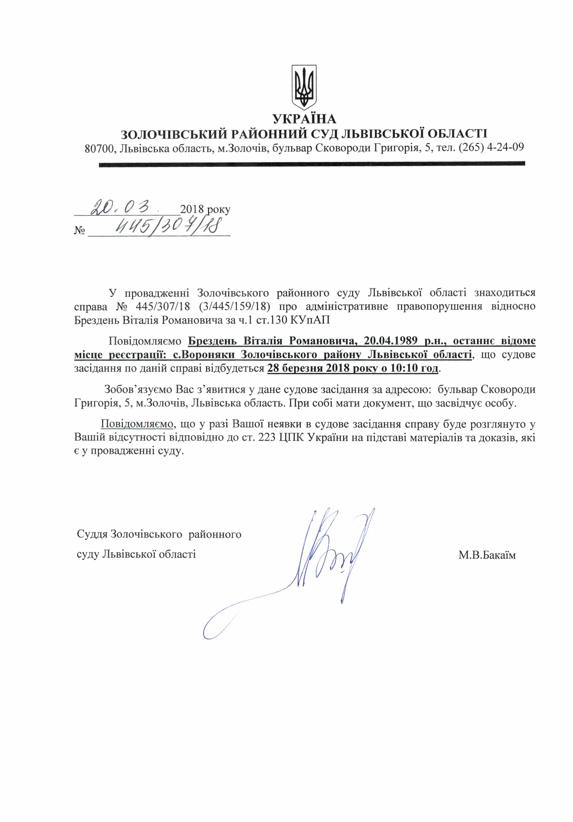 Оголошення про виклик в судове засідання Брездень В.Р. по справі № 445/307/18 про адміністративне правопорушення за ч. 1 ст. 130 КУпАП на 28.03.2018 року о 10:10 год.