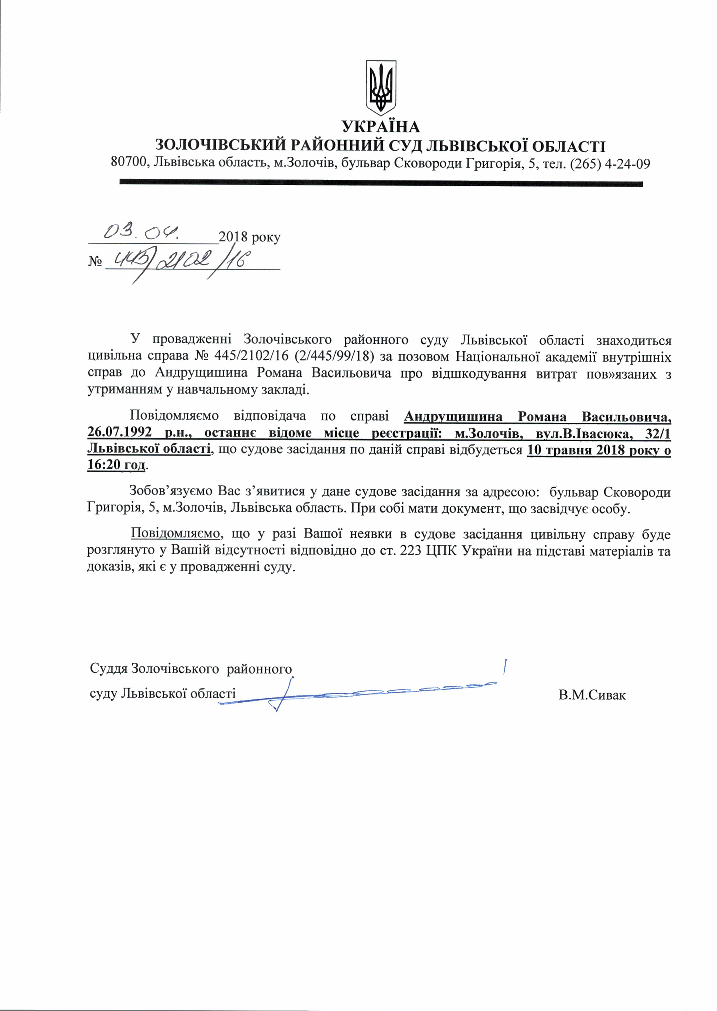 Оголошення про виклик в судове засідання Андрущишина Р.В. відповідача по справі №445/2102/16 на 10.05.5018 року о 16:20 год.
