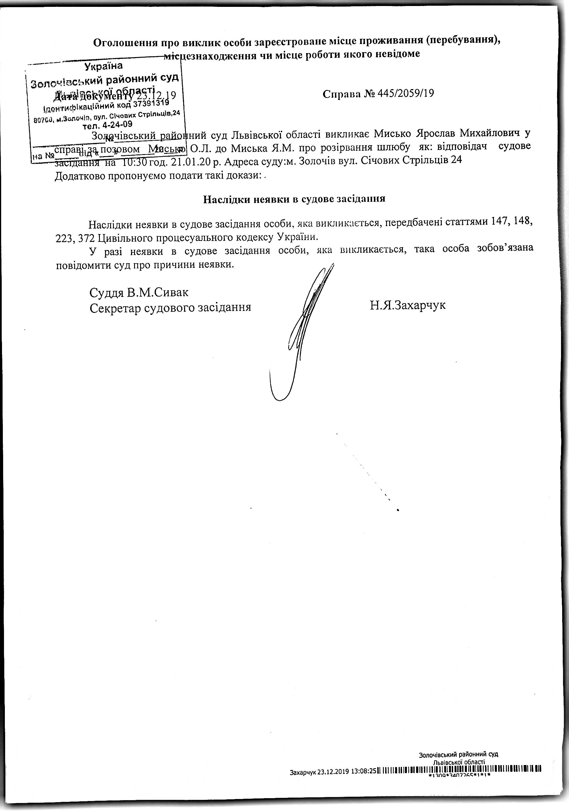 Оголошення про виклик в судове засідання Мисько Я.М. відповідача по справі № 445/2059/19 на 21.01.2020 року о 10:30 год.